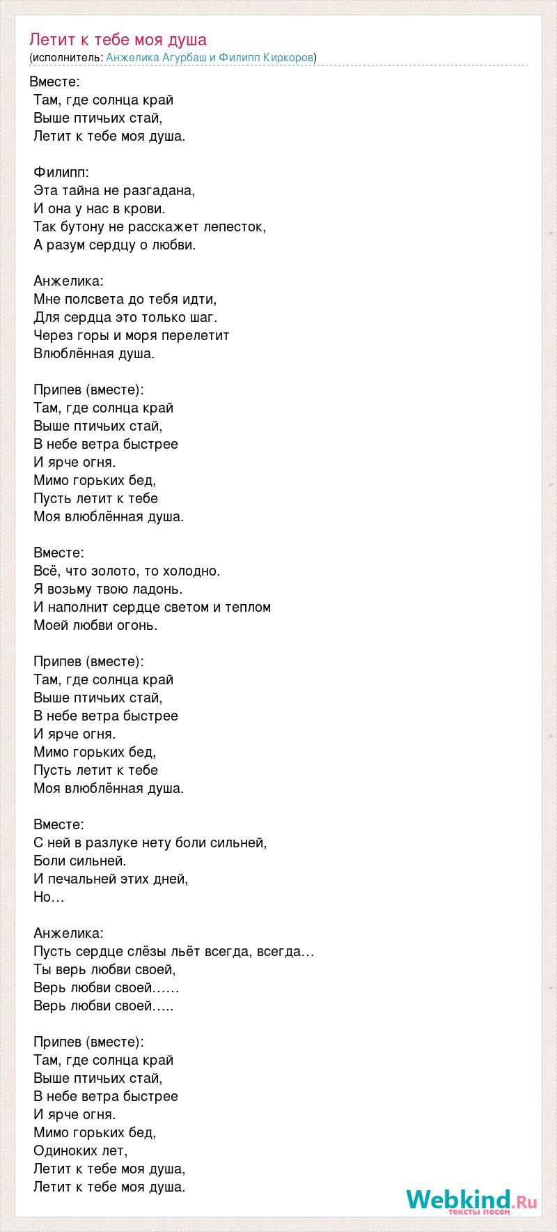 Вместе: Там, где солнца край Выше птичьих стай, Летит к тебе моя душа. Филипп: Эта тайна не разгадана, И она у нас в крови. Так бутону не расскажет лепесток, А разум сердцу о любви. Анжелика: Мне полсвета до тебя идти, Для сердца это только шаг. Через горы и моря перелетит Влюблённая душа. Припев (вместе): Там, где солнца край Выше птичьих стай, В небе ветра быстрее И ярче огня. Мимо горьких бед, Пусть летит к тебе Моя влюблённая душа. Вместе: Всё, что золото, то холодно. Я возьму твою ладонь. И наполнит сердце светом и теплом Моей любви огонь. Припев (вместе): Там, где солнца край Выше птичьих стай, В небе ветра быстрее И ярче огня. Мимо горьких бед, Пусть летит к тебе Моя влюблённая душа. Вместе: С ней в разлуке нету боли сильней, Боли сильней. И печальней этих дней, Но… Анжелика: Пусть сердце слёзы льёт всегда, всегда… Ты верь любви своей, Верь любви своей…… Верь любви своей….. Припев (вместе): Там, где солнца край Выше птичьих стай, В небе ветра быстрее И ярче огня. Мимо горьких бед, Одиноких лет, Летит к тебе моя душа, Летит к тебе моя душа.