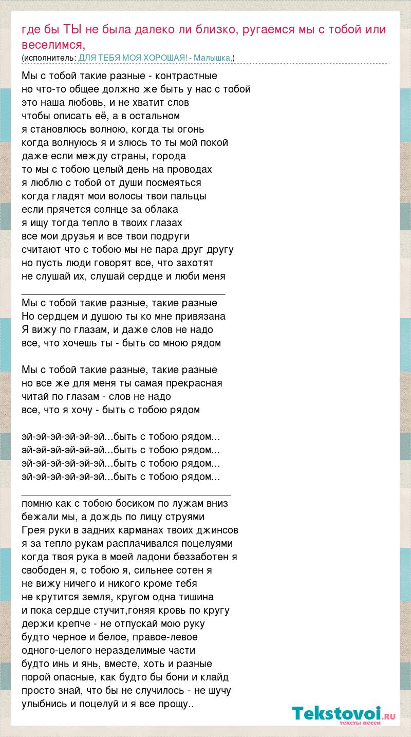 Мы с тобой такие разные - контрастные но что-то общее должно же быть у нас с тобой это наша любовь, и не хватит слов чтобы описать её, а в остальном я становлюсь волною, когда ты огонь когда волнуюсь я и злюсь то ты мой покой даже если между страны, города то мы с тобою целый день на проводах я люблю с тобой от души посмеяться когда гладят мои волосы твои пальцы если прячется солнце за облака я ищу тогда тепло в твоих глазах все мои друзья и все твои подруги считают что с тобою мы не пара друг другу но пусть люди говорят все, что захотят не слушай их, слушай сердце и люби меня ____________________________________ Мы с тобой такие разные, такие разные Но сердцем и душою ты ко мне привязана Я вижу по глазам, и даже слов не надо все, что хочешь ты - быть со мною рядом Мы с тобой такие разные, такие разные но все же для меня ты самая прекрасная читай по глазам - слов не надо все, что я хочу - быть с тобою рядом эй-эй-эй-эй-эй-эй...быть с тобою рядом... эй-эй-эй-эй-эй-эй...быть с тобою рядом... эй-эй-эй-эй-эй-эй...быть с тобою рядом... эй-эй-эй-эй-эй-эй...быть с тобою рядом... _____________________________________ помню как с тобою босиком по лужам вниз бежали мы, а дождь по лицу струями Грея руки в задних карманах твоих джинсов я за тепло рукам расплачивался поцелуями когда твоя рука в моей ладони беззаботен я свободен я, с тобою я, сильнее сотен я не вижу ничего и никого кроме тебя не крутится земля, кругом одна тишина и пока сердце стучит,гоняя кровь по кругу держи крепче - не отпускай мою руку будто черное и белое, правое-левое одного-целого неразделимые части будто инь и янь, вместе, хоть и разные порой опасные, как будто бы бони и клайд просто знай, что бы не случилось - не шучу улыбнись и поцелуй и я все прощу..