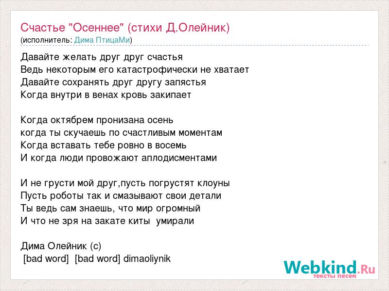 Давайте желать друг друг счастья Ведь некоторым его катастрофически не хватает Давайте сохранять друг другу запястья Когда внутри в венах кровь закипает Когда октябрем пронизана осень когда ты скучаешь по счастливым моментам Когда вставать тебе ровно в восемь И когда люди провожают аплодисментами И не грусти мой друг,пусть погрустят клоуны Пусть роботы так и смазывают свои детали Ты ведь сам знаешь, что мир огромный И что не зря на закате киты умирали Дима Олейник (с) [bad word] [bad word] dimaoliynik