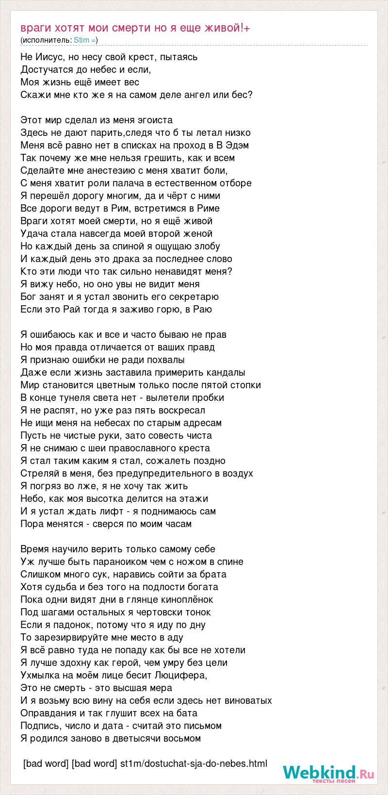 Не Иисус, но несу свой крест, пытаясь Достучатся до небес и если, Моя жизнь ещё имеет вес Скажи мне кто же я на самом деле ангел или бес? Этот мир сделал из меня эгоиста Здесь не дают парить,следя что б ты летал низко Меня всё равно нет в списках на проход в В Эдэм Так почему же мне нельзя грешить, как и всем Сделайте мне анестезию с меня хватит боли, С меня хватит роли палача в естественном отборе Я перешёл дорогу многим, да и чёрт с ними Все дороги ведут в Рим, встретимся в Риме Враги хотят моей смерти, но я ещё живой Удача стала навсегда моей второй женой Но каждый день за спиной я ощущаю злобу И каждый день это драка за последнее слово Кто эти люди что так сильно ненавидят меня? Я вижу небо, но оно увы не видит меня Бог занят и я устал звонить его секретарю Если это Рай тогда я заживо горю, в Раю Я ошибаюсь как и все и часто бываю не прав Но моя правда отличается от ваших правд Я признаю ошибки не ради похвалы Даже если жизнь заставила примерить кандалы Мир становится цветным только после пятой стопки В конце тунеля света нет - вылетели пробки Я не распят, но уже раз пять воскресал Не ищи меня на небесах по старым адресам Пусть не чистые руки, зато совесть чиста Я не снимаю с шеи православного креста Я стал таким каким я стал, сожалеть поздно Стреляй в меня, без предупредительного в воздух Я погряз во лже, я не хочу так жить Небо, как моя высотка делится на этажи И я устал ждать лифт - я поднимаюсь сам Пора менятся - сверся по моим часам Время научило верить только самому себе Уж лучше быть параноиком чем с ножом в спине Слишком много сук, наравись сойти за брата Хотя судьба и без того на подлости богата Пока одни видят дни в глянце киноплёнок Под шагами остальных я чертовски тонок Если я падонок, потому что я иду по дну То зарезирвируйте мне место в аду Я всё равно туда не попаду как бы все не хотели Я лучше здохну как герой, чем умру без цели Ухмылка на моём лице бесит Люцифера, Это не смерть - это высшая мера И я возьму всю вину на себя если здесь нет виноватых Оправдания и так глушит всех на бата Подпись, число и дата - считай это письмом Я родился заново в дветысячи восьмом [bad word] [bad word] st1m/dostuchat-sja-do-nebes.html