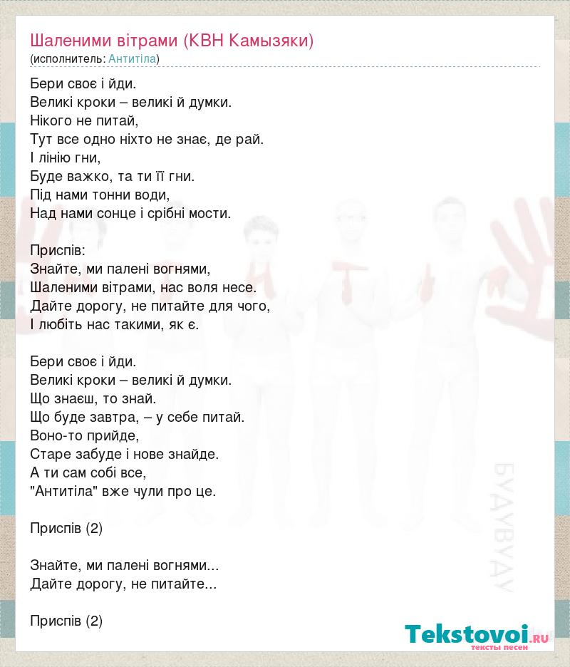 Бери своє і йди. Великі кроки – великі й думки. Нікого не питай, Тут все одно ніхто не знає, де рай. І лінію гни, Буде важко, та ти її гни. Під нами тонни води, Над нами сонце і срібні мости. Приспів: Знайте, ми палені вогнями, Шаленими вітрами, нас воля несе. Дайте дорогу, не питайте для чого, І любіть нас такими, як є. Бери своє і йди. Великі кроки – великі й думки. Що знаєш, то знай. Що буде завтра, – у себе питай. Воно-то прийде, Старе забуде і нове знайде. А ти сам собі все, "Антитіла" вже чули про це. Приспів (2) Знайте, ми палені вогнями... Дайте дорогу, не питайте... Приспів (2)