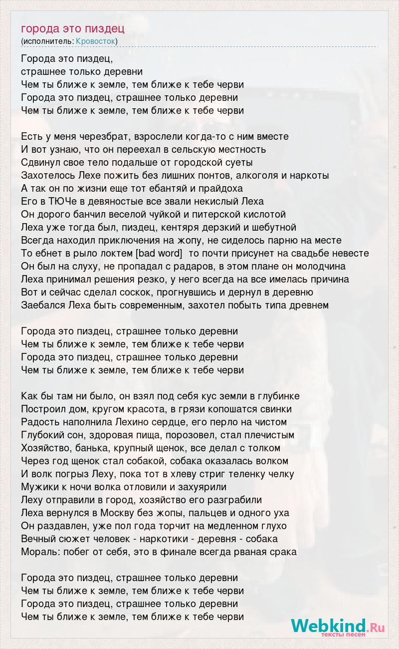 Города это пиздец, страшнее только деревни Чем ты ближе к земле, тем ближе к тебе черви Города это пиздец, страшнее только деревни Чем ты ближе к земле, тем ближе к тебе черви Есть у меня черезбрат, взрослели когда-то с ним вместе И вот узнаю, что он переехал в сельскую местность Сдвинул свое тело подальше от городской суеты Захотелось Лехе пожить без лишних понтов, алкоголя и наркоты А так он по жизни еще тот ебантяй и прайдоха Его в ТЮЧе в девяностые все звали некислый Леха Он дорого банчил веселой чуйкой и питерской кислотой Леха уже тогда был, пиздец, кентяря дерзкий и шебутной Всегда находил приключения на жопу, не сиделось парню на месте То ебнет в рыло локтем [bad word] то почти присунет на свадьбе невесте Он был на слуху, не пропадал с радаров, в этом плане он молодчина Леха принимал решения резко, у него всегда на все имелась причина Вот и сейчас сделал соскок, прогнувшись и дернул в деревню Заебался Леха быть современным, захотел побыть типа древнем Города это пиздец, страшнее только деревни Чем ты ближе к земле, тем ближе к тебе черви Города это пиздец, страшнее только деревни Чем ты ближе к земле, тем ближе к тебе черви Как бы там ни было, он взял под себя кус земли в глубинке Построил дом, кругом красота, в грязи копошатся свинки Радость наполнила Лехино сердце, его перло на чистом Глубокий сон, здоровая пища, порозовел, стал плечистым Хозяйство, банька, крупный щенок, все делал с толком Через год щенок стал собакой, собака оказалась волком И волк погрыз Леху, пока тот в хлеву стриг теленку челку Мужики к ночи волка отловили и захуярили Леху отправили в город, хозяйство его разграбили Леха вернулся в Москву без жопы, пальцев и одного уха Он раздавлен, уже пол года торчит на медленном глухо Вечный сюжет человек - наркотики - деревня - собака Мораль: побег от себя, это в финале всегда рваная срака Города это пиздец, страшнее только деревни Чем ты ближе к земле, тем ближе к тебе черви Города это пиздец, страшнее только деревни Чем ты ближе к земле, тем ближе к тебе черви