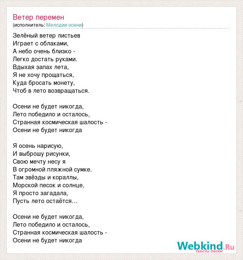 Зелёный ветер листьев Играет с облаками, А небо очень близко - Легко достать руками. Вдыхая запах лета, Я не хочу прощаться, Куда бросать монету, Чтоб в лето возвращаться. Осени не будет никогда, Лето победило и осталось, Странная космическая шалость - Осени не будет никогда Я осень нарисую, И выброшу рисунки, Свою мечту несу я В огромной пляжной сумке. Там звёзды и кораллы, Морской песок и солнце, Я просто загадала, Пусть лето остаётся… Осени не будет никогда, Лето победило и осталось, Странная космическая шалость - Осени не будет никогда