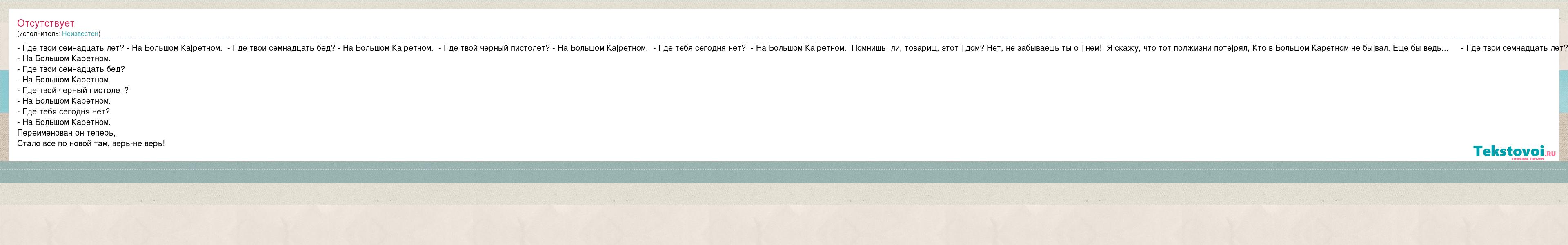 - Где твои семнадцать лет? - На Большом Ка|ретном. - Где твои семнадцать бед? - На Большом Ка|ретном. - Где твой черный пистолет? - На Большом Ка|ретном. - Где тебя сегодня нет? - На Большом Ка|ретном. Помнишь ли, товарищ, этот | дом? Нет, не забываешь ты о | нем! Я скажу, что тот полжизни поте|рял, Кто в Большом Каретном не бы|вал. Еще бы ведь... - Где твои семнадцать лет? - На Большом Каретном. - Где твои семнадцать бед? - На Большом Каретном. - Где твой черный пистолет? - На Большом Каретном. - Где тебя сегодня нет? - На Большом Каретном. Переименован он теперь, Стало все по новой там, верь-не верь!