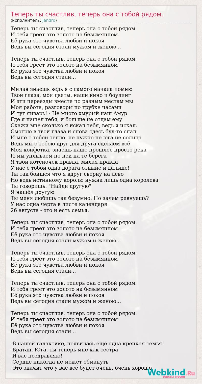 Теперь ты счастлив, теперь она с тобой рядом. И тебя греет это золото на безымянном Её рука это чувства любви и покоя Ведь вы сегодня стали мужом и женою... Теперь ты счастлив, теперь она с тобой рядом. И тебя греет это золото на безымянном Её рука это чувства любви и покоя Ведь вы сегодня стали... Милая знаешь ведь я с самого начала помню Твои глаза, мои цветы, наши кино и боулинг И эти переезды вместе по разным местам мы Моя работа, разговоры по трубке часами И тут январь! - Не много хмурый наш Амур Где я нашел тебя, и больше не отдам ему Скажи мне сколько я искал тебя, ведь я искал. Смотрю в твои глаза и снова сдесь буд-то спал И мне с тобой тепло, не нужно не юга не солнца Ведь мы с тобою друг для друга сделаем всё Моя конфетка, знаешь наше прошлое просто река И мы уплываем по ней на те берега Я твой котёночек правда, милая правда У нас с тобой одна дорага отныне и дальше! Ты так боишся что я вдруг сверну на лево Но ведь истинному королю нужна лишь одна королева Ты говоришь: "Найди другую" Я нашёл другую Ты меня любишь так безумно: Но зачем ревнуешь? У нас одна черта в листе календаря 26 августа - это и есть семья. Теперь ты счастлив, теперь она с тобой рядом. И тебя греет это золото на безымянном Её рука это чувства любви и покоя Ведь вы сегодня стали мужом и женою... Теперь ты счастлив, теперь она с тобой рядом. И тебя греет это золото на безымянном Её рука это чувства любви и покоя Ведь вы сегодня стали... Теперь ты счастлив, теперь она с тобой рядом. И тебя греет это золото на безымянном Её рука это чувства любви и покоя Ведь вы сегодня стали мужом и женою... Теперь ты счастлив, теперь она с тобой рядом. И тебя греет это золото на безымянном Её рука это чувства любви и покоя Ведь вы сегодня стали... -В нашей галактике, появилась еще одна крепкая семья! -Братан, Юга, ты теперь мне как сестра -Я вас поздравляю! -Сердце никогда не может обмануть -Это значит что у вас всё будет очень, очень хорошо.