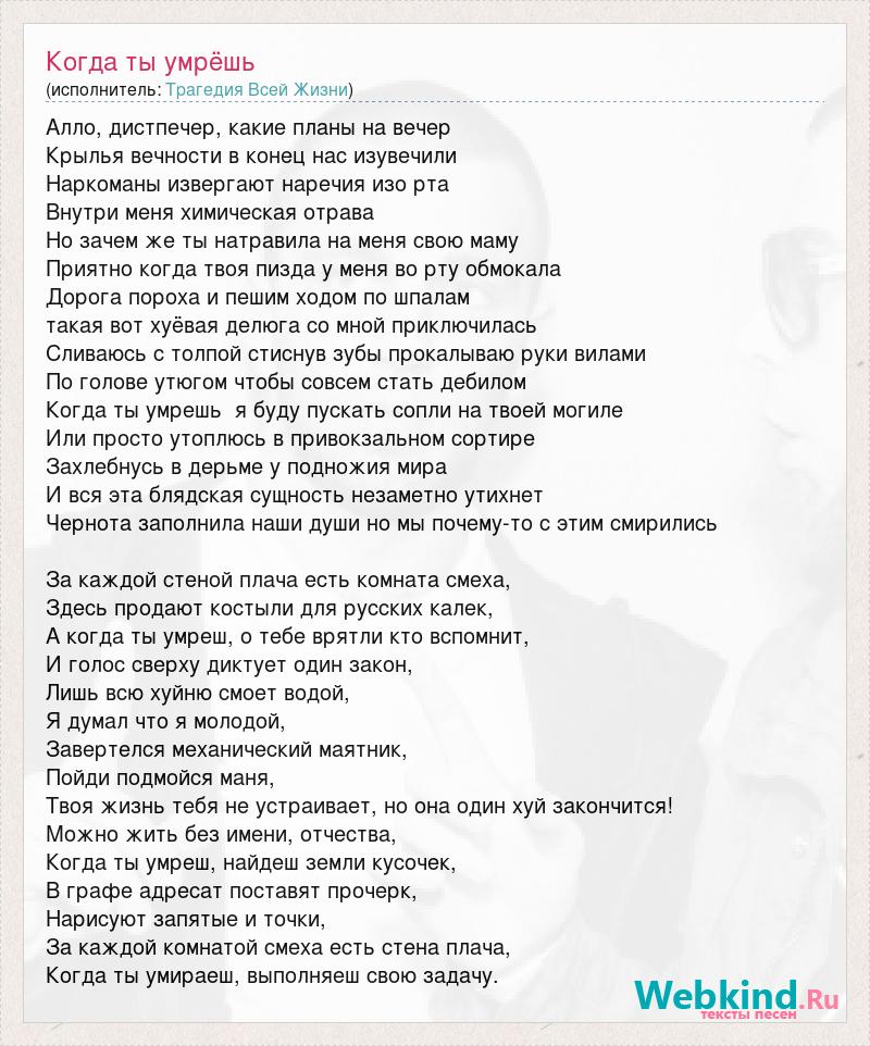 Алло, дистпечер, какие планы на вечер Крылья вечности в конец нас изувечили Наркоманы извергают наречия изо рта Внутри меня химическая отрава Но зачем же ты натравила на меня свою маму Приятно когда твоя пизда у меня во рту обмокала Дорога пороха и пешим ходом по шпалам такая вот хуёвая делюга со мной приключилась Сливаюсь с толпой стиснув зубы прокалываю руки вилами По голове утюгом чтобы совсем стать дебилом Когда ты умрешь я буду пускать сопли на твоей могиле Или просто утоплюсь в привокзальном сортире Захлебнусь в дерьме у подножия мира И вся эта блядская сущность незаметно утихнет Чернота заполнила наши души но мы почему-то с этим смирились За каждой стеной плача есть комната смеха, Здесь продают костыли для русских калек, А когда ты умреш, о тебе врятли кто вспомнит, И голос сверху диктует один закон, Лишь всю хуйню смоет водой, Я думал что я молодой, Завертелся механический маятник, Пойди подмойся маня, Твоя жизнь тебя не устраивает, но она один хуй закончится! Можно жить без имени, отчества, Когда ты умреш, найдеш земли кусочек, В графе адресат поставят прочерк, Нарисуют запятые и точки, За каждой комнатой смеха есть стена плача, Когда ты умираеш, выполняеш свою задачу.