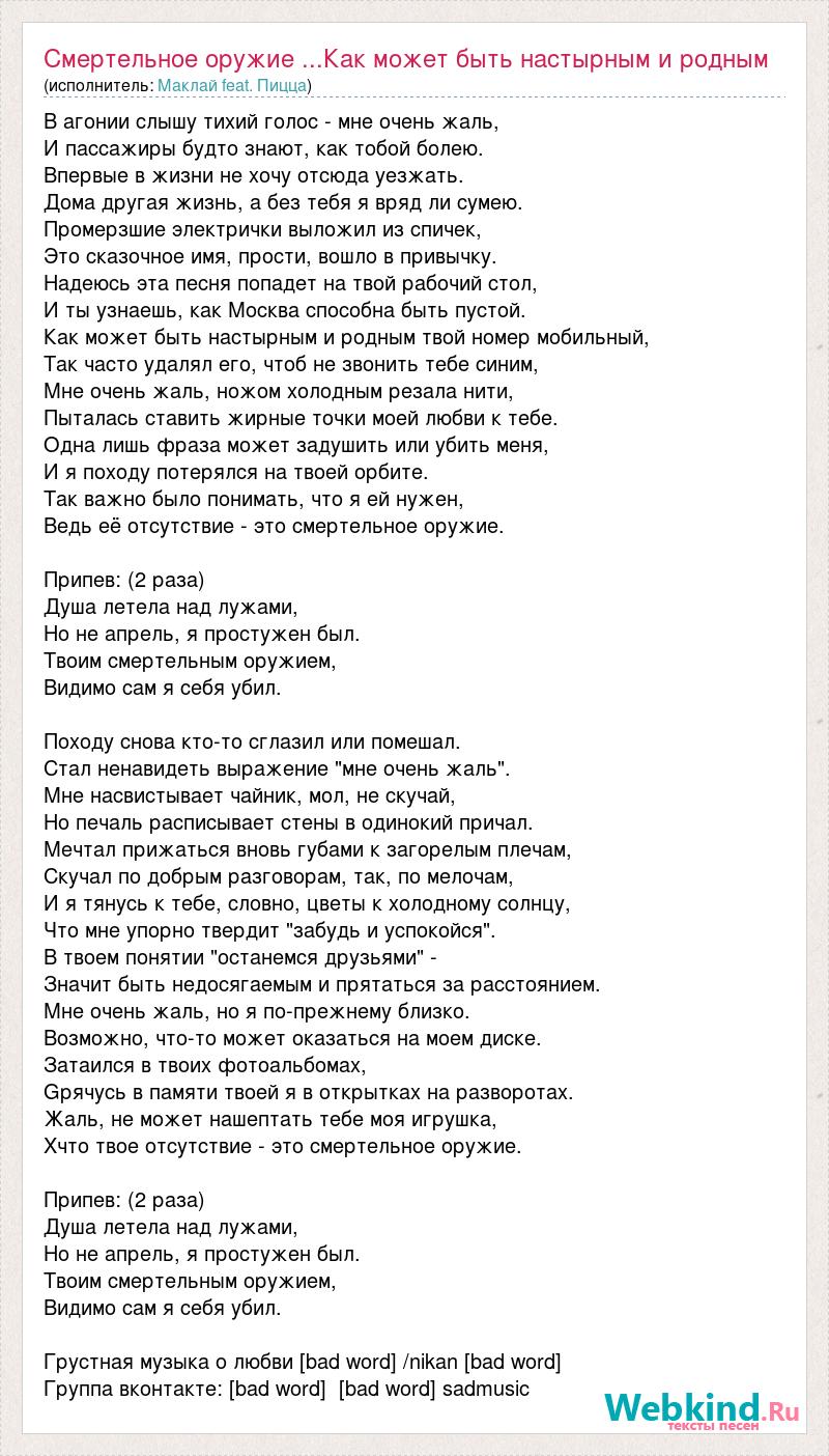 В агонии слышу тихий голос - мне очень жаль, И пассажиры будто знают, как тобой болею. Впервые в жизни не хочу отсюда уезжать. Дома другая жизнь, а без тебя я вряд ли сумею. Промерзшие электрички выложил из спичек, Это сказочное имя, прости, вошло в привычку. Надеюсь эта песня попадет на твой рабочий стол, И ты узнаешь, как Москва способна быть пустой. Как может быть настырным и родным твой номер мобильный, Так часто удалял его, чтоб не звонить тебе синим, Мне очень жаль, ножом холодным резала нити, Пыталась ставить жирные точки моей любви к тебе. Одна лишь фраза может задушить или убить меня, И я походу потерялся на твоей орбите. Так важно было понимать, что я ей нужен, Ведь её отсутствие - это смертельное оружие. Припев: (2 раза) Душа летела над лужами, Но не апрель, я простужен был. Твоим смертельным оружием, Видимо сам я себя убил. Походу снова кто-то сглазил или помешал. Стал ненавидеть выражение "мне очень жаль". Мне насвистывает чайник, мол, не скучай, Но печаль расписывает стены в одинокий причал. Мечтал прижаться вновь губами к загорелым плечам, Скучал по добрым разговорам, так, по мелочам, И я тянусь к тебе, словно, цветы к холодному солнцу, Что мне упорно твердит "забудь и успокойся". В твоем понятии "останемся друзьями" - Значит быть недосягаемым и прятаться за расстоянием. Мне очень жаль, но я по-прежнему близко. Возможно, что-то может оказаться на моем диске. Затаился в твоих фотоальбомах, Gрячусь в памяти твоей я в открытках на разворотах. Жаль, не может нашептать тебе моя игрушка, Xчто твое отсутствие - это смертельное оружие. Припев: (2 раза) Душа летела над лужами, Но не апрель, я простужен был. Твоим смертельным оружием, Видимо сам я себя убил. Грустная музыка о любви [bad word] /nikan [bad word] Группа вконтакте: [bad word] [bad word] sadmusic