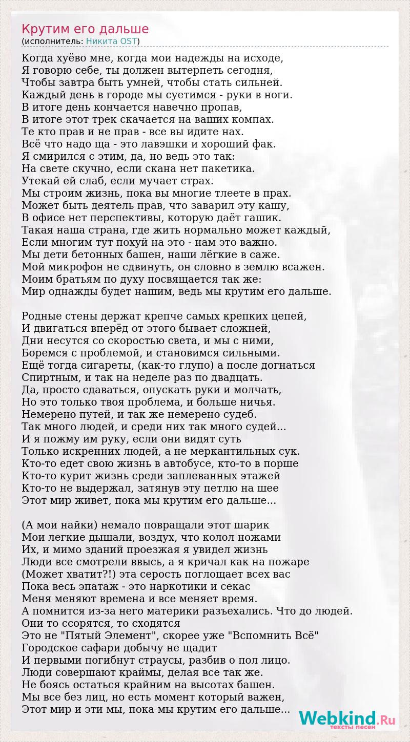 Когда хуёво мне, когда мои надежды на исходе, Я говорю себе, ты должен вытерпеть сегодня, Чтобы завтра быть умней, чтобы стать сильней. Каждый день в городе мы суетимся - руки в ноги. В итоге день кончается навечно пропав, В итоге этот трек скачается на ваших компах. Те кто прав и не прав - все вы идите нах. Всё что надо ща - это лавэшки и хороший фак. Я смирился с этим, да, но ведь это так: На свете скучно, если скана нет пакетика. Утекай ей слаб, если мучает страх. Мы строим жизнь, пока вы многие тлеете в прах. Может быть деятель прав, что заварил эту кашу, В офисе нет перспективы, которую даёт гашик. Такая наша страна, где жить нормально может каждый, Если многим тут похуй на это - нам это важно. Мы дети бетонных башен, наши лёгкие в саже. Мой микрофон не сдвинуть, он словно в землю всажен. Моим братьям по духу посвящается так же: Мир однажды будет нашим, ведь мы крутим его дальше. Родные стены держат крепче самых крепких цепей, И двигаться вперёд от этого бывает сложней, Дни несутся со скоростью света, и мы с ними, Боремся с проблемой, и становимся сильными. Ещё тогда сигареты, (как-то глупо) а после догнаться Спиртным, и так на неделе раз по двадцать. Да, просто сдаваться, опускать руки и молчать, Но это только твоя проблема, и больше ничья. Немерено путей, и так же немерено судеб. Так много людей, и среди них так много судей... И я пожму им руку, если они видят суть Только искренних людей, а не меркантильных сук. Кто-то едет свою жизнь в автобусе, кто-то в порше Кто-то курит жизнь среди заплеванных этажей Кто-то не выдержал, затянув эту петлю на шее Этот мир живет, пока мы крутим его дальше... (А мои найки) немало повращали этот шарик Мои легкие дышали, воздух, что колол ножами Их, и мимо зданий проезжая я увидел жизнь Люди все смотрели ввысь, а я кричал как на пожаре (Может хватит?!) эта серость поглощает всех вас Пока весь эпатаж - это наркотики и секас Меня меняют времена и все меняет время. А помнится из-за него материки разъехались. Что до людей. Они то ссорятся, то сходятся Это не "Пятый Элемент", скорее уже "Вспомнить Всё" Городское сафари добычу не щадит И первыми погибнут страусы, разбив о пол лицо. Люди совершают краймы, делая все так же. Не боясь остаться крайним на высотах башен. Мы все без лиц, но есть момент который важен, Этот мир и эти мы, пока мы крутим его дальше...