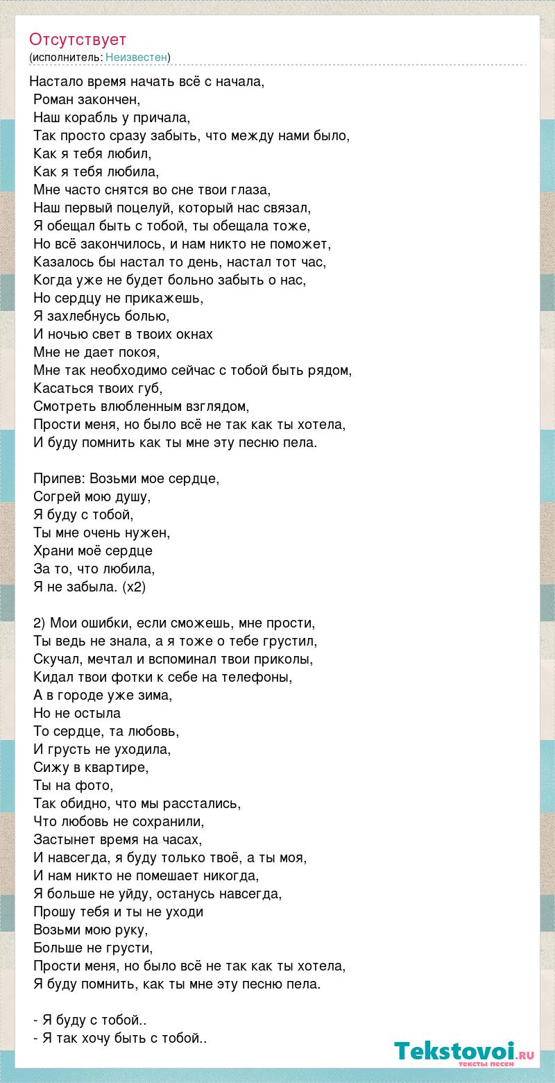 Настало время начать всё с начала, Роман закончен, Наш корабль у причала, Так просто сразу забыть, что между нами было, Как я тебя любил, Как я тебя любила, Мне часто снятся во сне твои глаза, Наш первый поцелуй, который нас связал, Я обещал быть с тобой, ты обещала тоже, Но всё закончилось, и нам никто не поможет, Казалось бы настал то день, настал тот час, Когда уже не будет больно забыть о нас, Но сердцу не прикажешь, Я захлебнусь болью, И ночью свет в твоих окнах Мне не дает покоя, Мне так необходимо сейчас с тобой быть рядом, Касаться твоих губ, Смотреть влюбленным взглядом, Прости меня, но было всё не так как ты хотела, И буду помнить как ты мне эту песню пела. Припев: Возьми мое сердце, Согрей мою душу, Я буду с тобой, Ты мне очень нужен, Храни моё сердце За то, что любила, Я не забыла. (х2) 2) Мои ошибки, если сможешь, мне прости, Ты ведь не знала, а я тоже о тебе грустил, Скучал, мечтал и вспоминал твои приколы, Кидал твои фотки к себе на телефоны, А в городе уже зима, Но не остыла То сердце, та любовь, И грусть не уходила, Сижу в квартире, Ты на фото, Так обидно, что мы расстались, Что любовь не сохранили, Застынет время на часах, И навсегда, я буду только твоё, а ты моя, И нам никто не помешает никогда, Я больше не уйду, останусь навсегда, Прошу тебя и ты не уходи Возьми мою руку, Больше не грусти, Прости меня, но было всё не так как ты хотела, Я буду помнить, как ты мне эту песню пела. - Я буду с тобой.. - Я так хочу быть с тобой..
