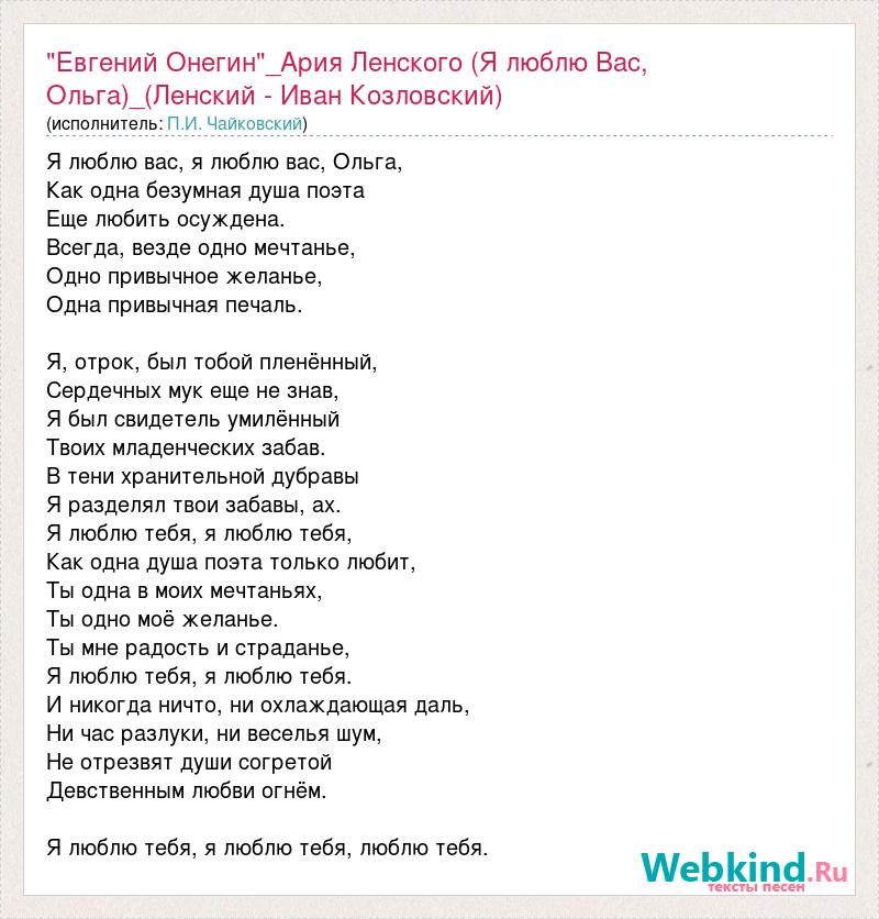 Я люблю вас, я люблю вас, Ольга, Как одна безумная душа поэта Еще любить осуждена. Всегда, везде одно мечтанье, Одно привычное желанье, Одна привычная печаль. Я, отрок, был тобой пленённый, Сердечных мук еще не знав, Я был свидетель умилённый Твоих младенческих забав. В тени хранительной дубравы Я разделял твои забавы, ах. Я люблю тебя, я люблю тебя, Как одна душа поэта только любит, Ты одна в моих мечтаньях, Ты одно моё желанье. Ты мне радость и страданье, Я люблю тебя, я люблю тебя. И никогда ничто, ни охлаждающая даль, Ни час разлуки, ни веселья шум, Не отрезвят души согретой Девственным любви огнём. Я люблю тебя, я люблю тебя, люблю тебя.