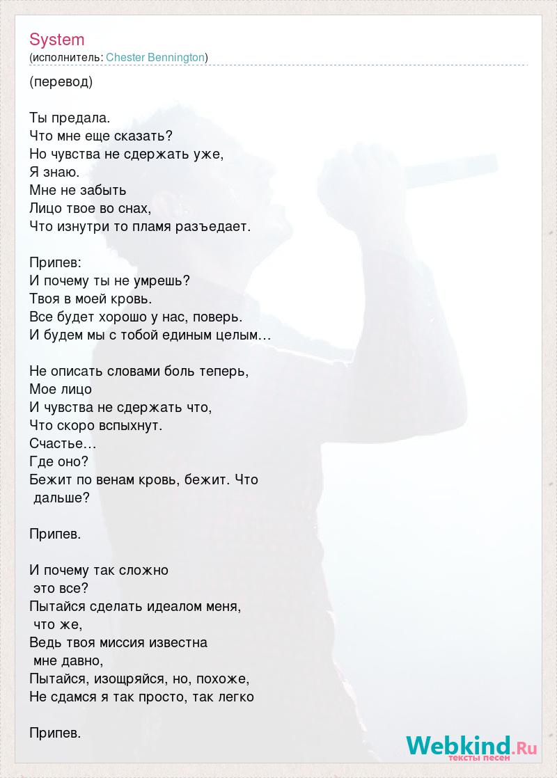 (перевод) Ты предала. Что мне еще сказать? Но чувства не сдержать уже, Я знаю. Мне не забыть Лицо твое во снах, Что изнутри то пламя разъедает. Припев: И почему ты не умрешь? Твоя в моей кровь. Все будет хорошо у нас, поверь. И будем мы с тобой единым целым… Не описать словами боль теперь, Мое лицо И чувства не сдержать что, Что скоро вспыхнут. Счастье… Где оно? Бежит по венам кровь, бежит. Что дальше? Припев. И почему так сложно это все? Пытайся сделать идеалом меня, что же, Ведь твоя миссия известна мне давно, Пытайся, изощряйся, но, похоже, Не сдамся я так просто, так легко Припев.