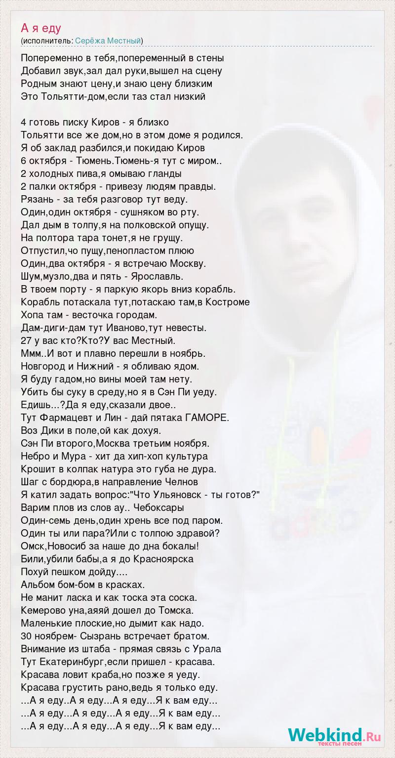 Попеременно в тебя,попеременный в стены Добавил звук,зал дал руки,вышел на сцену Родным знают цену,и знаю цену близким Это Тольятти-дом,если таз стал низкий 4 готовь писку Киров - я близко Тольятти все же дом,но в этом доме я родился. Я об заклад разбился,и покидаю Киров 6 октября - Тюмень.Тюмень-я тут с миром.. 2 холодных пива,я омываю гланды 2 палки октября - привезу людям правды. Рязань - за тебя разговор тут веду. Один,один октября - сушняком во рту. Дал дым в толпу,я на полковской опущу. На полтора тара тонет,я не грущу. Отпустил,чо пущу,пенопластом плюю Один,два октября - я встречаю Москву. Шум,музло,два и пять - Ярославль. В твоем порту - я паркую якорь вниз корабль. Корабль потаскала тут,потаскаю там,в Костроме Хопа там - весточка городам. Дам-диги-дам тут Иваново,тут невесты. 27 у вас кто?Кто?У вас Местный. Ммм..И вот и плавно перешли в ноябрь. Новгород и Нижний - я обливаю ядом. Я буду гадом,но вины моей там нету. Убить бы суку в среду,но я в Сэн Пи уеду. Едишь...?Да я еду,сказали двое.. Тут Фармацевт и Лин - дай пятака ГАМОРЕ. Воз Дики в поле,ой как дохуя. Сэн Пи второго,Москва третьим ноября. Небро и Мура - хит да хип-хоп культура Крошит в колпак натура это губа не дура. Шаг с бордюра,в направление Челнов Я катил задать вопрос:"Что Ульяновск - ты готов?" Варим плов из слов ау.. Чебоксары Один-семь день,один хрень все под паром. Один ты или пара?Или с толпою здравой? Омск,Новосиб за наше до дна бокалы! Били,убили бабы,а я до Красноярска Похуй пешком дойду.... Альбом бом-бом в красках. Не манит ласка и как тоска эта соска. Кемерово уна,аяяй дошел до Томска. Маленькие плоские,но дымит как надо. 30 ноябрем- Сызрань встречает братом. Внимание из штаба - прямая связь с Урала Тут Екатеринбург,если пришел - красава. Красава ловит краба,но позже я уеду. Красава грустить рано,ведь я только еду. ...А я еду..А я еду...А я еду...Я к вам еду... ...А я еду...А я еду...А я еду...Я к вам еду... ...А я еду...А я еду...А я еду...Я к вам еду...