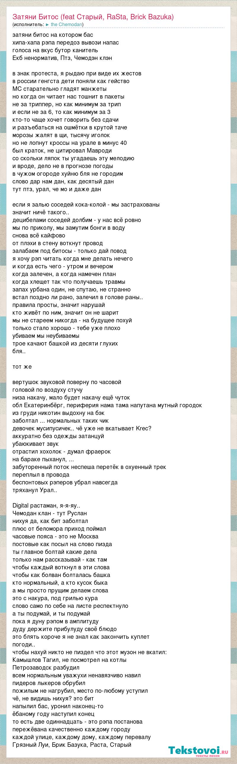 затяни битос на котором бас хипа-хапа рэпа передоз вывози напас голоса на вкус бутор канитель Екб ненорматив, Птз, Чемодэн клэн в знак протеста, я рыдаю при виде их жестов в россии генгста дети поняли как гейство МС старательно гладят манжеты но когда он читает нас тошнит в пакеты не за триппер, но как минимум за трип и если не за 6, то как минимум за 3 кто-то чаще хочет говорить без сдачи и разъебаться на ошмётки в крутой таче морозы жалят в щи, тысячу иголок но не лопнут кроссы на урале в минус 40 был краток, не цитировал Мавроди со скольки ляпок ты угадаешь эту мелодию и вроде, дело не в прогнозе погоды в чужом огороде хуйню бля не городим слово дар нам дан, как десятый дан тут птз, урал, че мо и даже дан если я залью соседей кока-колой - мы застрахованы значит ничё такого.. децибелами соседей долбим - у нас всё ровно мы по приколу, мы замутим бонги в воду снова всё кайфово от плэхи в стену воткнут провод залабаем под битосы - только дай повод я хочу рэп читать когда мне делать нечего и когда есть чего - утром и вечером когда залечен, а когда намечен план когда хлещет так что получаешь травмы запах урбана один, не спутаю, не странно встал поздно ли рано, залечил в голове раны.. правила просты, значит нарушай кто живёт по ним, значит он не шарит мы не стареем никогда - на будущее похуй только стало хорошо - тебе уже плохо убиваем мы неубиваемы трое качают башкой из десяти глухих бля.. тот же вертушок звуковой поверну по часовой головой по воздуху стучу низа накачу, мало будет накачу ещё чуток обл Екатеринбёрг, периферия нама тама напутана мутный городок из груди никотин выдохну на бэк заболтал ... нормальных таких чик девочек мусипусичек.. чё уже не вкатывает Krec? аккуратно без одежды затанцуй убаюкивает звук отрастил хохолок - думал фраерок на бараке пыханул, ... забуторенный поток неспеша перетёк в охуенный трек переплыл в провода беспонтовых рэперов убрал навсегда тряханул Урал.. Digital растаман, я-я-яу.. Чемодан клан - тут Руслан нихуя да, как бит заболтал плюс от беломора приход поймал часовые пояса - это не Москва постовые как посыл на слово пизда ты главное болтай какие дела только нам рассказывай - как там чтобы каждый воткнул в эти слова чтобы как болван болталась башка кто нормальный, а кто кусок быка а мы просто прущим делаем слова это с накура, под грилью кура слово само по себе на листе респектнуло а ты подумай, и ты подумай пока я дуну рэпом в амплитуду дуду держите прибулуду своё блюдо это блять короче я не знал как закончить куплет погоди.. чтобы нахуй никто не пиздел что этот музон не вкатил: Камышлов Тагил, не посмотрел на котлы Петрозаводск разбудил всем нормальным уважухи ненавязчиво навил пидеров лыкеров обрубил пожилым не нагрубил, место по-любому уступил чё, не видишь нихуя? это бит напылил бас, уронил наконец-то ёбаному году наступил конец то есть две одиннадцать - это рэпа постанова пережёвана качественно каждому городу каждой улице, каждому дому, каждому перевалу Грязный Луи, Брик Базука, Раста, Старый