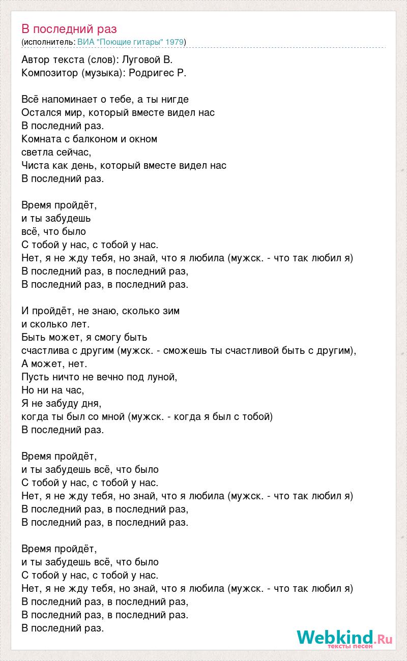 Автор текста (слов): Луговой В. Композитор (музыка): Родригес Р. Всё напоминает о тебе, а ты нигде Остался мир, который вместе видел нас В последний раз. Комната с балконом и окном светла сейчас, Чиста как день, который вместе видел нас В последний раз. Время пройдёт, и ты забудешь всё, что было С тобой у нас, с тобой у нас. Нет, я не жду тебя, но знай, что я любила (мужск. - что так любил я) В последний раз, в последний раз, В последний раз, в последний раз. И пройдёт, не знаю, сколько зим и сколько лет. Быть может, я смогу быть счастлива с другим (мужск. - сможешь ты счастливой быть с другим), А может, нет. Пусть ничто не вечно под луной, Но ни на час, Я не забуду дня, когда ты был со мной (мужск. - когда я был с тобой) В последний раз. Время пройдёт, и ты забудешь всё, что было С тобой у нас, с тобой у нас. Нет, я не жду тебя, но знай, что я любила (мужск. - что так любил я) В последний раз, в последний раз, В последний раз, в последний раз. Время пройдёт, и ты забудешь всё, что было С тобой у нас, с тобой у нас. Нет, я не жду тебя, но знай, что я любила (мужск. - что так любил я) В последний раз, в последний раз, В последний раз, в последний раз. В последний раз.