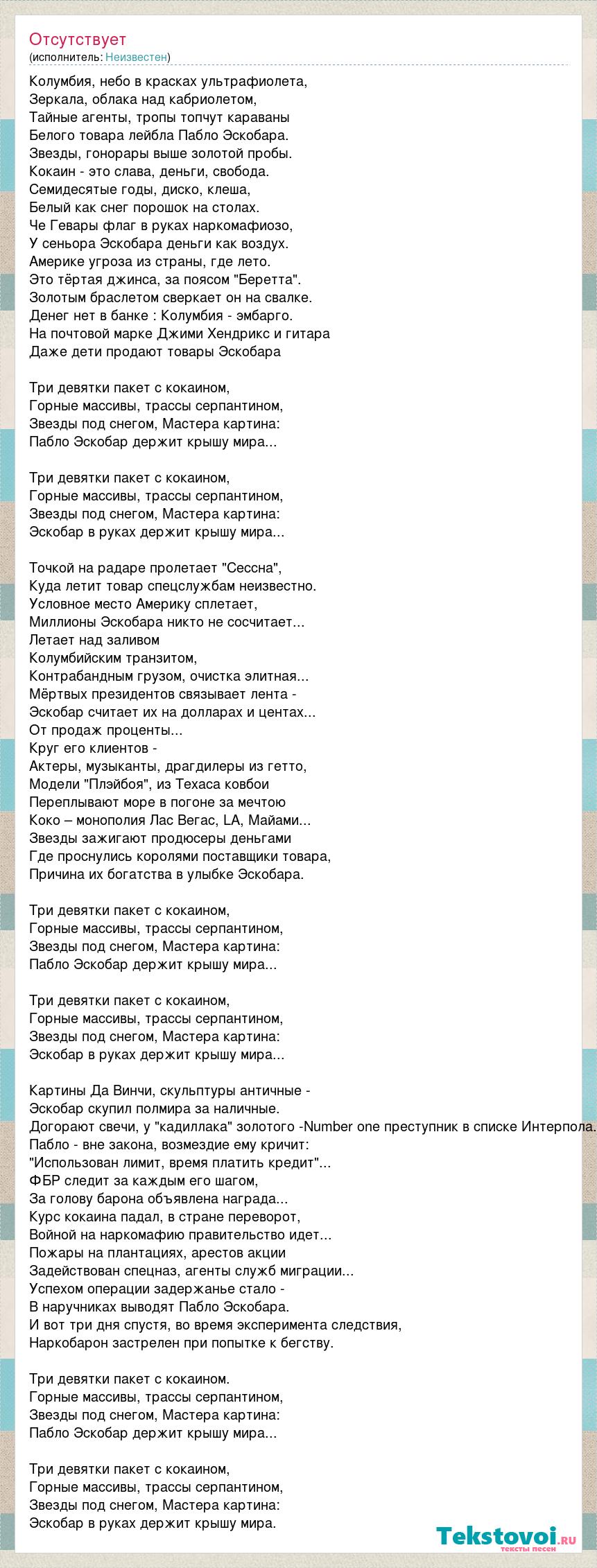 Колумбия, небо в красках ультрафиолета, Зеркала, облака над кабриолетом, Тайные агенты, тропы топчут караваны Белого товара лейбла Пабло Эскобара. Звезды, гонорары выше золотой пробы. Кокаин - это слава, деньги, свобода. Семидесятые годы, диско, клеша, Белый как снег порошок на столах. Че Гевары флаг в руках наркомафиозо, У сеньора Эскобара деньги как воздух. Америке угроза из страны, где лето. Это тёртая джинса, за поясом "Беретта". Золотым браслетом сверкает он на свалке. Денег нет в банке : Колумбия - эмбарго. На почтовой марке Джими Хендрикс и гитара Даже дети продают товары Эскобара Три девятки пакет с кокаином, Горные массивы, трассы серпантином, Звезды под снегом, Мастера картина: Пабло Эскобар держит крышу мира... Три девятки пакет с кокаином, Горные массивы, трассы серпантином, Звезды под снегом, Мастера картина: Эскобар в руках держит крышу мира... Точкой на радаре пролетает "Сессна", Куда летит товар спецслужбам неизвестно. Условное место Америку сплетает, Миллионы Эскобара никто не сосчитает... Летает над заливом Колумбийским транзитом, Контрабандным грузом, очистка элитная... Мёртвых президентов связывает лента - Эскобар считает их на долларах и центах... От продаж проценты... Круг его клиентов - Актеры, музыканты, драгдилеры из гетто, Модели "Плэйбоя", из Техаса ковбои Переплывают море в погоне за мечтою Коко – монополия Лас Вегас, LA, Майами... Звезды зажигают продюсеры деньгами Где проснулись королями поставщики товара, Причина их богатства в улыбке Эскобара. Три девятки пакет с кокаином, Горные массивы, трассы серпантином, Звезды под снегом, Мастера картина: Пабло Эскобар держит крышу мира... Три девятки пакет с кокаином, Горные массивы, трассы серпантином, Звезды под снегом, Мастера картина: Эскобар в руках держит крышу мира... Картины Да Винчи, скульптуры античные - Эскобар скупил полмира за наличные. Догорают свечи, у "кадиллака" золотого -Number one преступник в списке Интерпола. Пабло - вне закона, возмездие ему кричит: "Использован лимит, время платить кредит"... ФБР следит за каждым его шагом, За голову барона объявлена награда... Курс кокаина падал, в стране переворот, Войной на наркомафию правительство идет... Пожары на плантациях, арестов акции Задействован спецназ, агенты служб миграции... Успехом операции задержанье стало - В наручниках выводят Пабло Эскобара. И вот три дня спустя, во время эксперимента следствия, Наркобарон застрелен при попытке к бегству. Три девятки пакет с кокаином. Горные массивы, трассы серпантином, Звезды под снегом, Мастера картина: Пабло Эскобар держит крышу мира... Три девятки пакет с кокаином, Горные массивы, трассы серпантином, Звезды под снегом, Мастера картина: Эскобар в руках держит крышу мира.