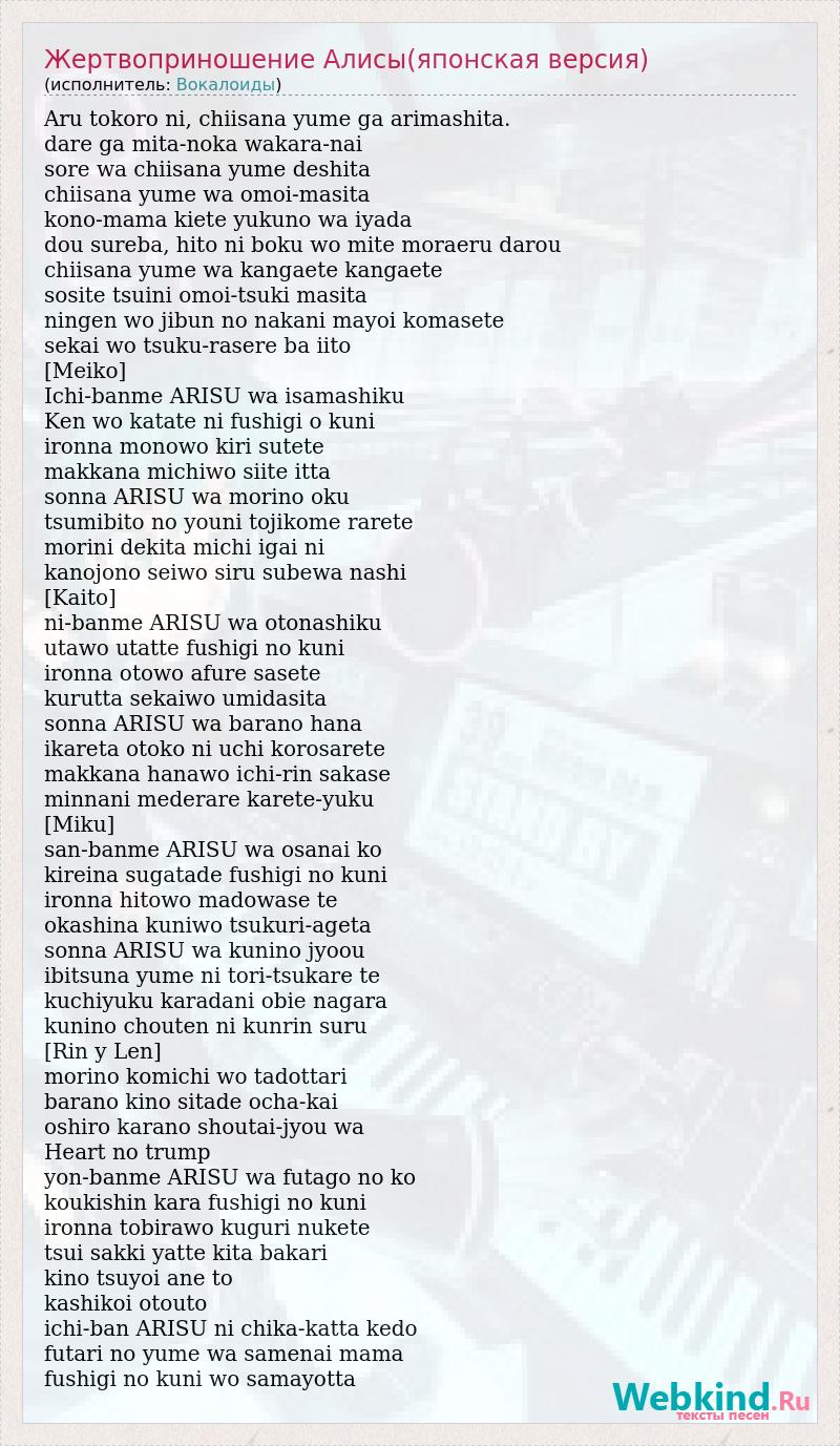 Aru tokoro ni, chiisana yume ga arimashita. dare ga mita-noka wakara-nai sore wa chiisana yume deshita chiisana yume wa omoi-masita kono-mama kiete yukuno wa iyada dou sureba, hito ni boku wo mite moraeru darou chiisana yume wa kangaete kangaete sosite tsuini omoi-tsuki masita ningen wo jibun no nakani mayoi komasete sekai wo tsuku-rasere ba iito [Meiko] Ichi-banme ARISU wa isamashiku Ken wo katate ni fushigi o kuni ironna monowo kiri sutete makkana michiwo siite itta sonna ARISU wa morino oku tsumibito no youni tojikome rarete morini dekita michi igai ni kanojono seiwo siru subewa nashi [Kaito] ni-banme ARISU wa otonashiku utawo utatte fushigi no kuni ironna otowo afure sasete kurutta sekaiwo umidasita sonna ARISU wa barano hana ikareta otoko ni uchi korosarete makkana hanawo ichi-rin sakase minnani mederare karete-yuku [Miku] san-banme ARISU wa osanai ko kireina sugatade fushigi no kuni ironna hitowo madowase te okashina kuniwo tsukuri-ageta sonna ARISU wa kunino jyoou ibitsuna yume ni tori-tsukare te kuchiyuku karadani obie nagara kunino chouten ni kunrin suru [Rin y Len] morino komichi wo tadottari barano kino sitade ocha-kai oshiro karano shoutai-jyou wa Heart no trump yon-banme ARISU wa futago no ko koukishin kara fushigi no kuni ironna tobirawo kuguri nukete tsui sakki yatte kita bakari kino tsuyoi ane to kashikoi otouto ichi-ban ARISU ni chika-katta kedo futari no yume wa samenai mama fushigi no kuni wo samayotta
