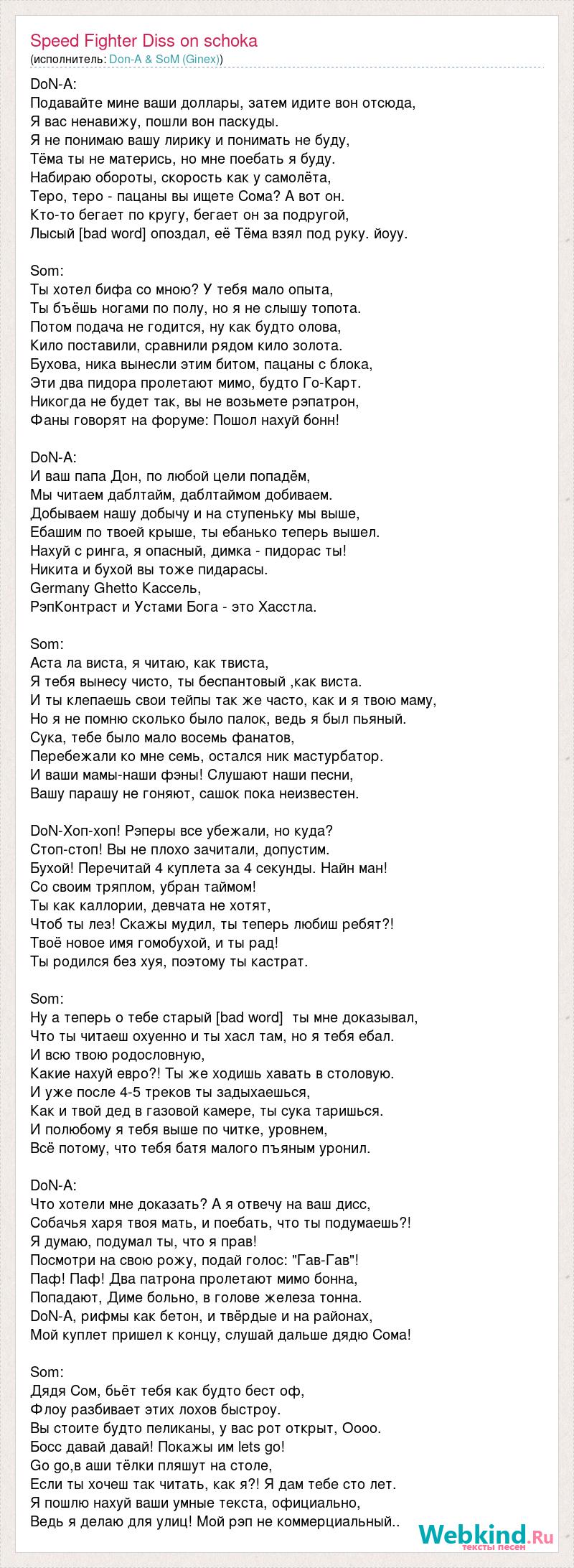 DoN-A: Подавайте мине ваши доллары, затем идите вон отсюда, Я вас ненавижу, пошли вон паскуды. Я не понимаю вашу лирику и понимать не буду, Тёма ты не матерись, но мне поебать я буду. Набираю обороты, скорость как у самолёта, Теро, теро - пацаны вы ищете Сома? А вот он. Кто-то бегает по кругу, бегает он за подругой, Лысый [bad word] опоздал, её Тёма взял под руку. йоуу. Som: Ты хотел бифа со мною? У тебя мало опыта, Ты бъёшь ногами по полу, но я не слышу топота. Потом подача не годится, ну как будто олова, Кило поставили, сравнили рядом кило золота. Бухова, ника вынесли этим битом, пацаны с блока, Эти два пидора пролетают мимо, будто Го-Карт. Никогда не будет так, вы не возьмете рэпатрон, Фаны говорят на форуме: Пошол нахуй бонн! DoN-A: И ваш папа Дон, по любой цели попадём, Мы читаем даблтайм, даблтаймом добиваем. Добываем нашу добычу и на ступеньку мы выше, Ебашим по твоей крыше, ты ебанько теперь вышел. Нахуй с ринга, я опасный, димка - пидорас ты! Никита и бухой вы тоже пидарасы. Germany Ghetto Кассель, РэпКонтраст и Устами Бога - это Хасстла. Som: Аста ла виста, я читаю, как твиста, Я тебя вынесу чисто, ты беспантовый ,как виста. И ты клепаешь свои тейпы так же часто, как и я твою маму, Но я не помню сколько было палок, ведь я был пьяный. Сука, тебе было мало восемь фанатов, Перебежали ко мне семь, остался ник мастурбатор. И ваши мамы-наши фэны! Слушают наши песни, Вашу парашу не гоняют, сашок пока неизвестен. DoN-Хоп-хоп! Рэперы все убежали, но куда? Стоп-стоп! Вы не плохо зачитали, допустим. Бухой! Перечитай 4 куплета за 4 секунды. Найн ман! Со своим тряплом, убран таймом! Ты как каллории, девчата не хотят, Чтоб ты лез! Скажы мудил, ты теперь любиш ребят?! Твоё новое имя гомобухой, и ты рад! Ты родился без хуя, поэтому ты кастрат. Som: Ну а теперь о тебе старый [bad word] ты мне доказывал, Что ты читаеш охуенно и ты хасл там, но я тебя ебал. И всю твою родословную, Какие нахуй евро?! Ты же ходишь хавать в столовую. И уже после 4-5 треков ты задыхаешься, Как и твой дед в газовой камере, ты сука таришься. И полюбому я тебя выше по читке, уровнем, Всё потому, что тебя батя малого пъяным уронил. DoN-A: Что хотели мне доказать? А я отвечу на ваш дисс, Собачья харя твоя мать, и поебать, что ты подумаешь?! Я думаю, подумал ты, что я прав! Посмотри на свою рожу, подай голос: "Гав-Гав"! Паф! Паф! Два патрона пролетают мимо бонна, Попадают, Диме больно, в голове железа тонна. DoN-A, рифмы как бетон, и твёрдые и на районах, Мой куплет пришел к концу, слушай дальше дядю Сома! Som: Дядя Сом, бьёт тебя как будто бест оф, Флоу разбивает этих лохов быстроу. Вы стоите будто пеликаны, у вас рот открыт, Оооо. Босс давай давай! Покажы им lets go! Go go,в аши тёлки пляшут на столе, Если ты хочеш так читать, как я?! Я дам тебе сто лет. Я пошлю нахуй ваши умные текста, официально, Ведь я делаю для улиц! Мой рэп не коммерциальный..
