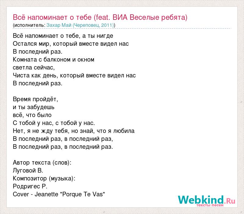 Всё напоминает о тебе, а ты нигде Остался мир, который вместе видел нас В последний раз. Комната с балконом и окном светла сейчас, Чиста как день, который вместе видел нас В последний раз. Время пройдёт, и ты забудешь всё, что было С тобой у нас, с тобой у нас. Нет, я не жду тебя, но знай, что я любила В последний раз, в последний раз, В последний раз, в последний раз. Автор текста (слов): Луговой В. Композитор (музыка): Родригес Р. Cover - Jeanette "Porque Te Vas"