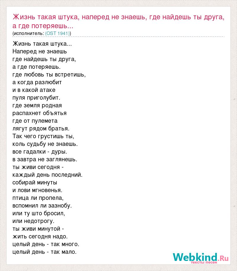 Жизнь такая штука... Наперед не знаешь где найдешь ты друга, а где потеряешь. где любовь ты встретишь, а когда разлюбит и в какой атаке пуля приголубит. где земля родная распахнет объятья где от пулемета лягут рядом братья. Так чего грустишь ты, коль судьбу не знаешь. все гадалки - дуры. в завтра не заглянешь. ты живи сегодня - каждый день последний. собирай минуты и лови мгновенья. птица ли пропела, вспомнил ли зазнобу. или ту што бросил, или недотрогу. ты живи минутой - жить сегодня надо. целый день - так много. целый день - так мало.