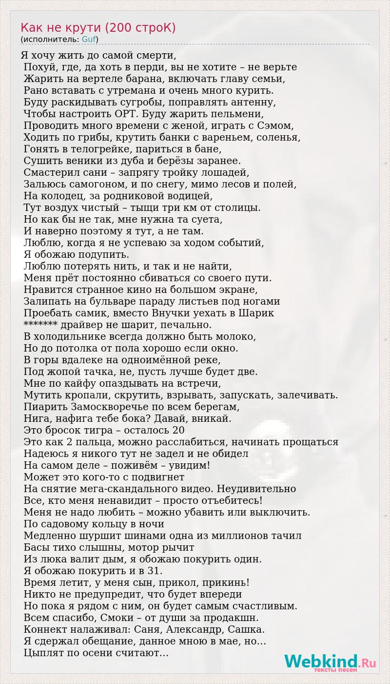Я хочу жить до самой смерти, Похуй, где, да хоть в перди, вы не хотите – не верьте Жарить на вертеле барана, включать главу семьи, Рано вставать с утремана и очень много курить. Буду раскидывать сугробы, поправлять антенну, Чтобы настроить ОРТ. Буду жарить пельмени, Проводить много времени с женой, играть с Сэмом, Ходить по грибы, крутить банки с вареньем, соленья, Гонять в телогрейке, париться в бане, Сушить веники из дуба и берёзы заранее. Смастерил сани – запрягу тройку лошадей, Зальюсь самогоном, и по снегу, мимо лесов и полей, На колодец, за родниковой водицей, Тут воздух чистый – тыщи три км от столицы. Но как бы не так, мне нужна та суета, И наверно поэтому я тут, а не там. Люблю, когда я не успеваю за ходом событий, Я обожаю подупить. Люблю потерять нить, и так и не найти, Меня прёт постоянно сбиваться со своего пути. Нравится странное кино на большом экране, Залипать на бульваре параду листьев под ногами Проебать самик, вместо Внучки уехать в Шарик ******* драйвер не шарит, печально. В холодильнике всегда должно быть молоко, Но до потолка от пола хорошо если окно. В горы вдалеке на одноимённой реке, Под жопой тачка, не, пусть лучше будет две. Мне по кайфу опаздывать на встречи, Мутить кропали, скрутить, взрывать, запускать, залечивать. Пиарить Замоскворечье по всем берегам, Нига, нафига тебе бока? Давай, вникай. Это бросок тигра – осталось 20 Это как 2 пальца, можно расслабиться, начинать прощаться Надеюсь я никого тут не задел и не обидел На самом деле – поживём – увидим! Может это кого-то с подвигнет На снятие мега-скандального видео. Неудивительно Все, кто меня ненавидит – просто отъебитесь! Меня не надо любить – можно убавить или выключить. По садовому кольцу в ночи Медленно шуршит шинами одна из миллионов тачил Басы тихо слышны, мотор рычит Из люка валит дым, я обожаю покурить один. Я обожаю покурить и в 31. Время летит, у меня сын, прикол, прикинь! Никто не предупредит, что будет впереди Но пока я рядом с ним, он будет самым счастливым. Всем спасибо, Смоки – от души за продакшн. Коннект налаживал: Саня, Александр, Сашка. Я сдержал обещание, данное мною в мае, но… Цыплят по осени считают…