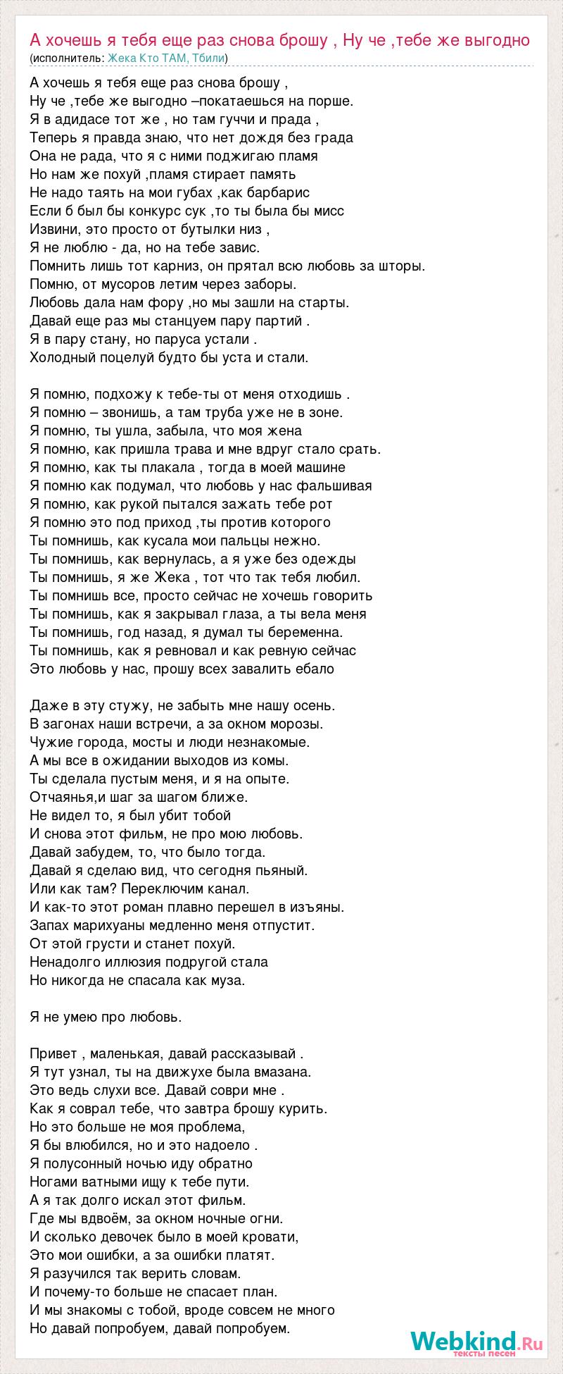 А хочешь я тебя еще раз снова брошу , Ну че ,тебе же выгодно –покатаешься на порше. Я в адидасе тот же , но там гуччи и прада , Теперь я правда знаю, что нет дождя без града Она не рада, что я с ними поджигаю пламя Но нам же похуй ,пламя стирает память Не надо таять на мои губах ,как барбарис Если б был бы конкурс сук ,то ты была бы мисс Извини, это просто от бутылки низ , Я не люблю - да, но на тебе завис. Помнить лишь тот карниз, он прятал всю любовь за шторы. Помню, от мусоров летим через заборы. Любовь дала нам фору ,но мы зашли на старты. Давай еще раз мы станцуем пару партий . Я в пару стану, но паруса устали . Холодный поцелуй будто бы уста и стали. Я помню, подхожу к тебе-ты от меня отходишь . Я помню – звонишь, а там труба уже не в зоне. Я помню, ты ушла, забыла, что моя жена Я помню, как пришла трава и мне вдруг стало срать. Я помню, как ты плакала , тогда в моей машине Я помню как подумал, что любовь у нас фальшивая Я помню, как рукой пытался зажать тебе рот Я помню это под приход ,ты против которого Ты помнишь, как кусала мои пальцы нежно. Ты помнишь, как вернулась, а я уже без одежды Ты помнишь, я же Жека , тот что так тебя любил. Ты помнишь все, просто сейчас не хочешь говорить Ты помнишь, как я закрывал глаза, а ты вела меня Ты помнишь, год назад, я думал ты беременна. Ты помнишь, как я ревновал и как ревную сейчас Это любовь у нас, прошу всех завалить ебало Даже в эту стужу, не забыть мне нашу осень. В загонах наши встречи, а за окном морозы. Чужие города, мосты и люди незнакомые. А мы все в ожидании выходов из комы. Ты сделала пустым меня, и я на опыте. Отчаянья,и шаг за шагом ближе. Не видел то, я был убит тобой И снова этот фильм, не про мою любовь. Давай забудем, то, что было тогда. Давай я сделаю вид, что сегодня пьяный. Или как там? Переключим канал. И как-то этот роман плавно перешел в изъяны. Запах марихуаны медленно меня отпустит. От этой грусти и станет похуй. Ненадолго иллюзия подругой стала Но никогда не спасала как муза. Я не умею про любовь. Привет , маленькая, давай рассказывай . Я тут узнал, ты на движухе была вмазана. Это ведь слухи все. Давай соври мне . Как я соврал тебе, что завтра брошу курить. Но это больше не моя проблема, Я бы влюбился, но и это надоело . Я полусонный ночью иду обратно Ногами ватными ищу к тебе пути. А я так долго искал этот фильм. Где мы вдвоём, за окном ночные огни. И сколько девочек было в моей кровати, Это мои ошибки, а за ошибки платят. Я разучился так верить словам. И почему-то больше не спасает план. И мы знакомы с тобой, вроде совсем не много Но давай попробуем, давай попробуем.