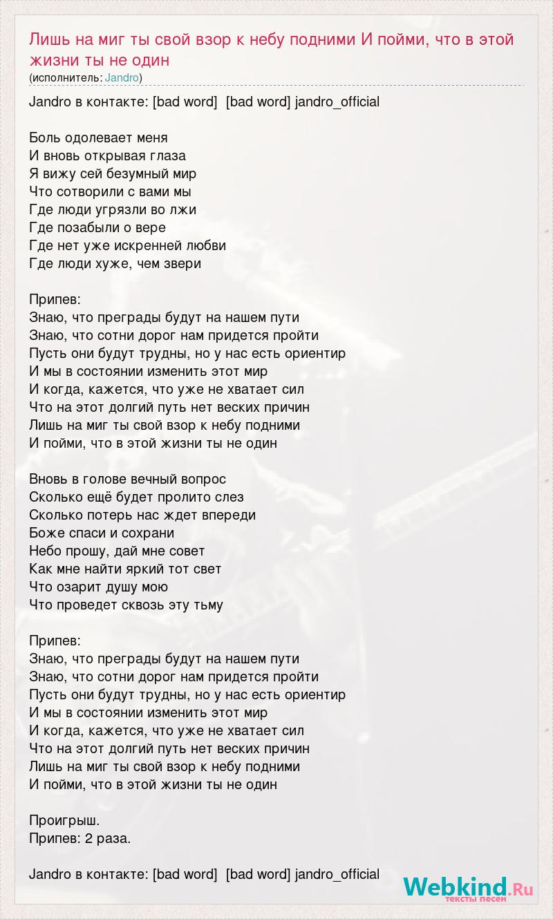 Jandro в контакте: [bad word] [bad word] jandro_official Боль одолевает меня И вновь открывая глаза Я вижу сей безумный мир Что сотворили с вами мы Где люди угрязли во лжи Где позабыли о вере Где нет уже искренней любви Где люди хуже, чем звери Припев: Знаю, что преграды будут на нашем пути Знаю, что сотни дорог нам придется пройти Пусть они будут трудны, но у нас есть ориентир И мы в состоянии изменить этот мир И когда, кажется, что уже не хватает сил Что на этот долгий путь нет веских причин Лишь на миг ты свой взор к небу подними И пойми, что в этой жизни ты не один Вновь в голове вечный вопрос Сколько ещё будет пролито слез Сколько потерь нас ждет впереди Боже спаси и сохрани Небо прошу, дай мне совет Как мне найти яркий тот свет Что озарит душу мою Что проведет сквозь эту тьму Припев: Знаю, что преграды будут на нашем пути Знаю, что сотни дорог нам придется пройти Пусть они будут трудны, но у нас есть ориентир И мы в состоянии изменить этот мир И когда, кажется, что уже не хватает сил Что на этот долгий путь нет веских причин Лишь на миг ты свой взор к небу подними И пойми, что в этой жизни ты не один Проигрыш. Припев: 2 раза. Jandro в контакте: [bad word] [bad word] jandro_official