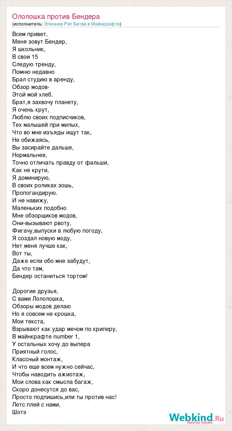 Всем привет, Меня зовут Бендер, Я школьник, В свои 15 Следую тренду, Помню недавно Брал студию в аренду, Обзор модов- Этой мой хлеб. Брат,я захвочу планету, Я очень крут, Люблю своих подписчиков, Тех малышей при милых, Что во мне изъяды ищут так, Не обижаясь, Вы засирайте дальше, Нормальнее, Точно отличать правду от фальши, Как не крути, Я доминирую, В своих роликах зошь, Пропогандирую. И не навижу, Маленьких подобно Мне обзорщиков модов, Они-вызывают рвоту, Фигачу,выпуски в любую погоду, Я создал новую моду, Нет меня лучше как, Вот ты, Даже если обо мне забудут, Да что там, Бендер останиться тортом! Дорогие друзья, С вами Лололошка, Обзоры модов делаю Но я совсем не крошка, Мои текста, Взрывают как удар мечом по криперу, В майнкрафте number 1, У остальных хочу до выпера Приятный голос, Классный монтаж, И что еще всем нужно сейчас, Чтобы наводить ажиотаж, Мои слова как смысла багаж, Скоро донесутся до вас, Просто подпишись,или ты против нас! Летс плей с нами, Шотэ
