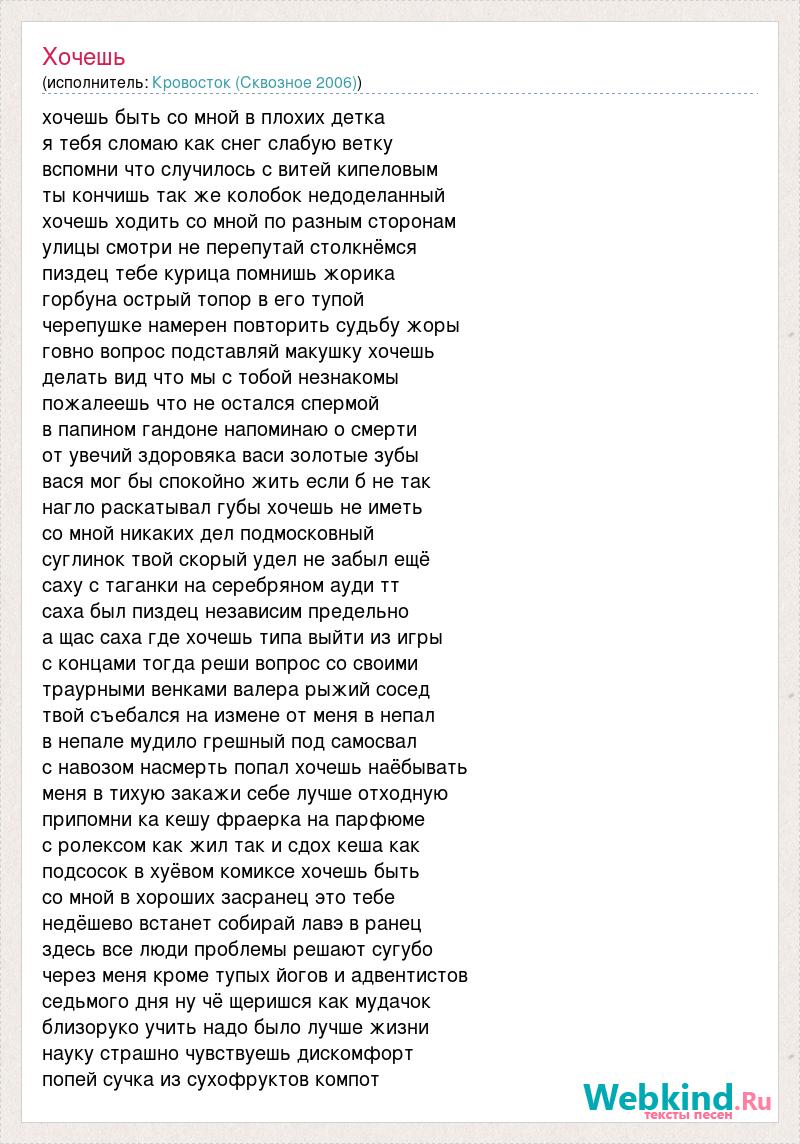 хочешь быть со мной в плохих детка я тебя сломаю как снег слабую ветку вспомни что случилось с витей кипеловым ты кончишь так же колобок недоделанный хочешь ходить со мной по разным сторонам улицы смотри не перепутай столкнёмся пиздец тебе курица помнишь жорика горбуна острый топор в его тупой черепушке намерен повторить судьбу жоры говно вопрос подставляй макушку хочешь делать вид что мы с тобой незнакомы пожалеешь что не остался спермой в папином гандоне напоминаю о смерти от увечий здоровяка васи золотые зубы вася мог бы спокойно жить если б не так нагло раскатывал губы хочешь не иметь со мной никаких дел подмосковный суглинок твой скорый удел не забыл ещё саху с таганки на серебряном ауди тт саха был пиздец независим предельно а щас саха где хочешь типа выйти из игры с концами тогда реши вопрос со своими траурными венками валера рыжий сосед твой съебался на измене от меня в непал в непале мудило грешный под самосвал с навозом насмерть попал хочешь наёбывать меня в тихую закажи себе лучше отходную припомни ка кешу фраерка на парфюме с ролексом как жил так и сдох кеша как подсосок в хуёвом комиксе хочешь быть со мной в хороших засранец это тебе недёшево встанет собирай лавэ в ранец здесь все люди проблемы решают сугубо через меня кроме тупых йогов и адвентистов седьмого дня ну чё щеришся как мудачок близоруко учить надо было лучше жизни науку страшно чувствуешь дискомфорт попей сучка из сухофруктов компот