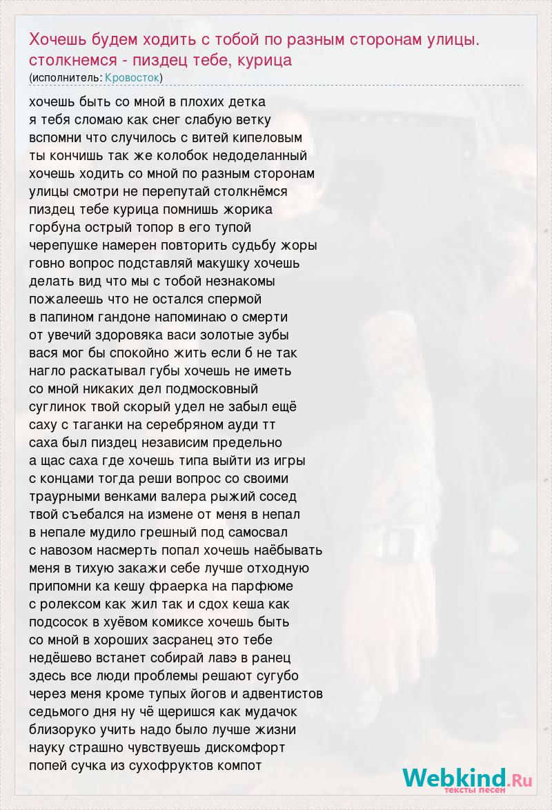 Главная→Исполнители→Кровосток→Хочешь будем ходить с тобой по разным сторонам улицы. столкнемся - пиздец тебе,