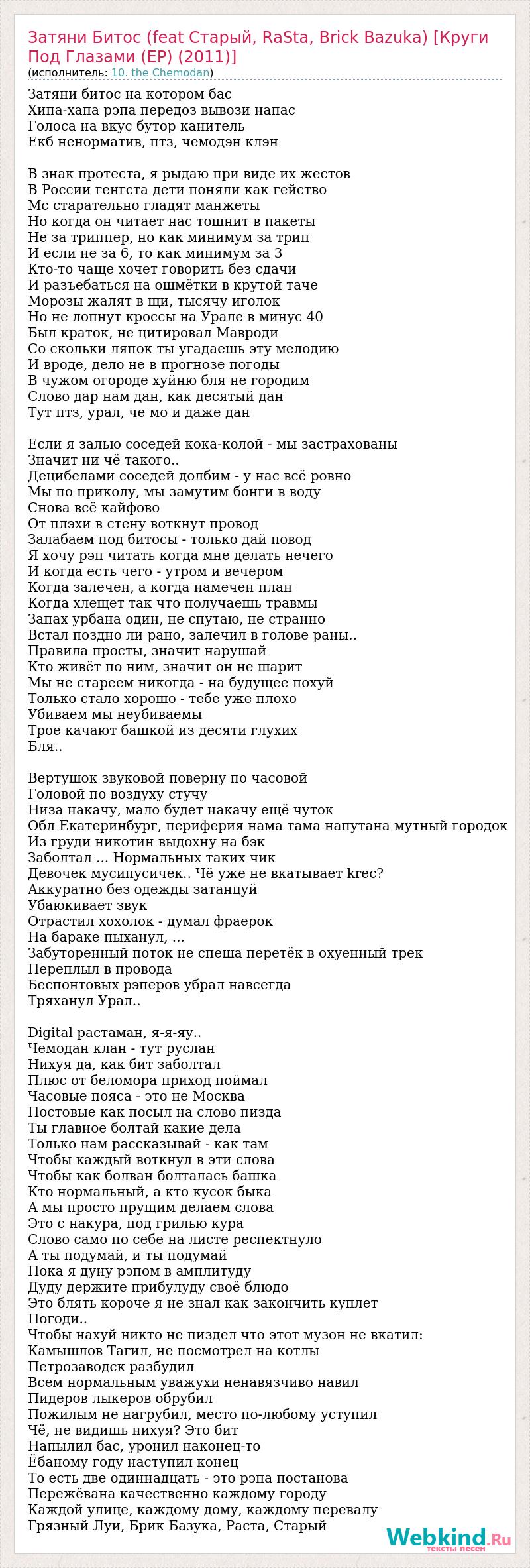 Затяни битос на котором бас Хипа-хапа рэпа передоз вывози напас Голоса на вкус бутор канитель Екб ненорматив, птз, чемодэн клэн В знак протеста, я рыдаю при виде их жестов В России генгста дети поняли как гейство Мс старательно гладят манжеты Но когда он читает нас тошнит в пакеты Не за триппер, но как минимум за трип И если не за 6, то как минимум за 3 Кто-то чаще хочет говорить без сдачи И разъебаться на ошмётки в крутой таче Морозы жалят в щи, тысячу иголок Но не лопнут кроссы на Урале в минус 40 Был краток, не цитировал Мавроди Со скольки ляпок ты угадаешь эту мелодию И вроде, дело не в прогнозе погоды В чужом огороде хуйню бля не городим Слово дар нам дан, как десятый дан Тут птз, урал, че мо и даже дан Если я залью соседей кока-колой - мы застрахованы Значит ни чё такого.. Децибелами соседей долбим - у нас всё ровно Мы по приколу, мы замутим бонги в воду Снова всё кайфово От плэхи в стену воткнут провод Залабаем под битосы - только дай повод Я хочу рэп читать когда мне делать нечего И когда есть чего - утром и вечером Когда залечен, а когда намечен план Когда хлещет так что получаешь травмы Запах урбана один, не спутаю, не странно Встал поздно ли рано, залечил в голове раны.. Правила просты, значит нарушай Кто живёт по ним, значит он не шарит Мы не стареем никогда - на будущее похуй Только стало хорошо - тебе уже плохо Убиваем мы неубиваемы Трое качают башкой из десяти глухих Бля.. Вертушок звуковой поверну по часовой Головой по воздуху стучу Низа накачу, мало будет накачу ещё чуток Обл Екатеринбург, периферия нама тама напутана мутный городок Из груди никотин выдохну на бэк Заболтал ... Нормальных таких чик Девочек мусипусичек.. Чё уже не вкатывает krec? Аккуратно без одежды затанцуй Убаюкивает звук Отрастил хохолок - думал фраерок На бараке пыханул, ... Забуторенный поток не спеша перетёк в охуенный трек Переплыл в провода Беспонтовых рэперов убрал навсегда Тряханул Урал.. Digital растаман, я-я-яу.. Чемодан клан - тут руслан Нихуя да, как бит заболтал Плюс от беломора приход поймал Часовые пояса - это не Москва Постовые как посыл на слово пизда Ты главное болтай какие дела Только нам рассказывай - как там Чтобы каждый воткнул в эти слова Чтобы как болван болталась башка Кто нормальный, а кто кусок быка А мы просто прущим делаем слова Это с накура, под грилью кура Слово само по себе на листе респектнуло А ты подумай, и ты подумай Пока я дуну рэпом в амплитуду Дуду держите прибулуду своё блюдо Это блять короче я не знал как закончить куплет Погоди.. Чтобы нахуй никто не пиздел что этот музон не вкатил: Камышлов Тагил, не посмотрел на котлы Петрозаводск разбудил Всем нормальным уважухи ненавязчиво навил Пидеров лыкеров обрубил Пожилым не нагрубил, место по-любому уступил Чё, не видишь нихуя? Это бит Напылил бас, уронил наконец-то Ёбаному году наступил конец То есть две одиннадцать - это рэпа постанова Пережёвана качественно каждому городу Каждой улице, каждому дому, каждому перевалу Грязный Луи, Брик Базука, Раста, Старый