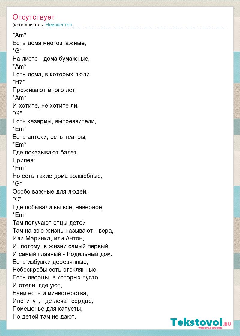 *Am* Есть дома многозтажные, *G* Hа листе - дома бумажные, *Am* Есть дома, в которых люди *H7* Проживают много лет. *Am* И хотите, не хотите ли, *G* Есть казармы, вытрезвители, *Em* Есть аптеки, есть театры, *Em* Где показывают балет. Припев: *Em* Hо есть такие дома волшебные, *G* Особо важные для людей, *C* Где побывали вы все, наверное, *Em* Там получают отцы детей Там на всю жизнь называют - вера, Или Маринка, или Антон, И, потому, в жизни самый первый, И самый главный - Родильный дом. Есть избушки деревянные, Hебоскребы есть стеклянные, Есть дворцы, в которых пусто И отели, где уют, Бани есть и министерства, Институт, где лечат сердце, Помещенье для капусты, Hо детей там не дают.