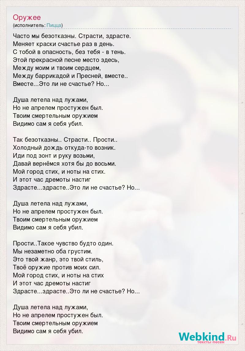 Часто мы безотказны. Страсти, здрасте. Меняет краски счастье раз в день. С тобой в опасность, без тебя - в тень. Этой прекрасной песне место здесь, Между моим и твоим сердцем, Между баррикадой и Пресней, вместе.. Вместе...Это ли не счастье? Но... Душа летела над лужами, Но не апрелем простужен был. Твоим смертельным оружием Видимо сам я себя убил. Так безотказны.. Страсти.. Прости.. Холодный дождь откуда-то возник. Иди под зонт и руку возьми, Давай вернёмся хотя бы до восьми. Мой город стих, и ноты на стих. И этот час дремоты настиг Здрасте...здрасте..Это ли не счастье? Но... Душа летела над лужами, Но не апрелем простужен был. Твоим смертельным оружием Видимо сам я себя убил. Прости..Такое чувство будто один. Мы незаметно оба грустим. Это твой жанр, это твой стиль, Твоё оружие против моих сил. Мой город стих, и ноты на стих И этот час дремоты настиг Здрасте...здрасте..Это ли не счастье? Но... Душа летела над лужами, Но не апрелем простужен был. Твоим смертельным оружием Видимо сам я себя убил.