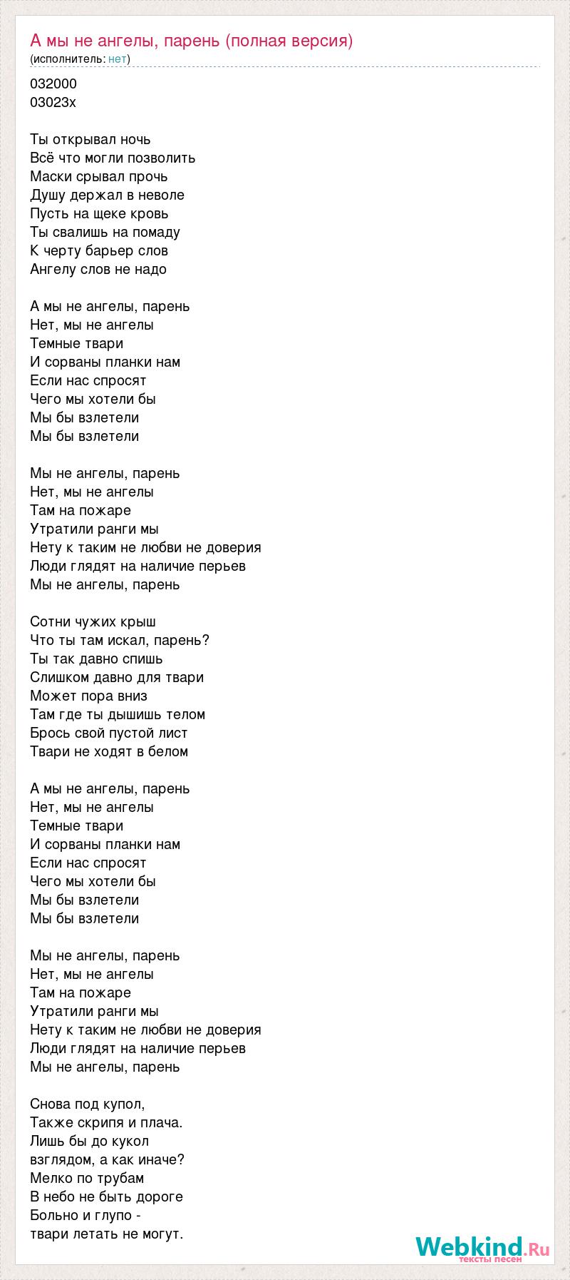 032000 03023x Ты открывал ночь Всё что могли позволить Маски срывал прочь Душу держал в неволе Пусть на щеке кровь Ты свалишь на помаду К черту барьер слов Ангелу слов не надо А мы не ангелы, парень Нет, мы не ангелы Темные твари И сорваны планки нам Если нас спросят Чего мы хотели бы Мы бы взлетели Мы бы взлетели Мы не ангелы, парень Нет, мы не ангелы Там на пожаре Утратили ранги мы Нету к таким не любви не доверия Люди глядят на наличие перьев Мы не ангелы, парень Сотни чужих крыш Что ты там искал, парень? Ты так давно спишь Слишком давно для твари Может пора вниз Там где ты дышишь телом Брось свой пустой лист Твари не ходят в белом А мы не ангелы, парень Нет, мы не ангелы Темные твари И сорваны планки нам Если нас спросят Чего мы хотели бы Мы бы взлетели Мы бы взлетели Мы не ангелы, парень Нет, мы не ангелы Там на пожаре Утратили ранги мы Нету к таким не любви не доверия Люди глядят на наличие перьев Мы не ангелы, парень Снова под купол, Также скрипя и плача. Лишь бы до кукол взглядом, а как иначе? Мелко по трубам В небо не быть дороге Больно и глупо - твари летать не могут.