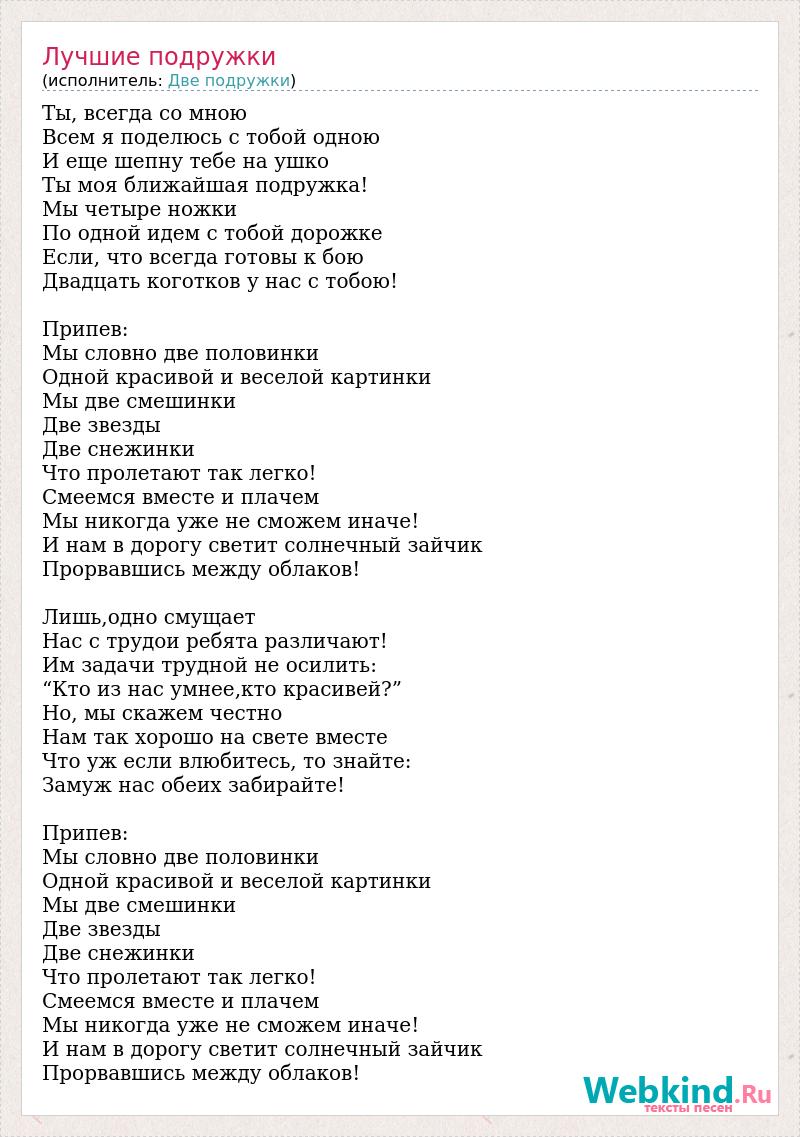Ты, всегда со мною Всем я поделюсь с тобой одною И еще шепну тебе на ушко Ты моя ближайшая подружка! Мы четыре ножки По одной идем с тобой дорожке Если, что всегда готовы к бою Двадцать коготков у нас с тобою! Припев: Мы словно две половинки Одной красивой и веселой картинки Мы две смешинки Две звезды Две снежинки Что пролетают так легко! Смеемся вместе и плачем Мы никогда уже не сможем иначе! И нам в дорогу светит солнечный зайчик Прорвавшись между облаков! Лишь,одно смущает Нас с трудои ребята различают! Им задачи трудной не осилить: “Кто из нас умнее,кто красивей?” Но, мы скажем честно Нам так хорошо на свете вместе Что уж если влюбитесь, то знайте: Замуж нас обеих забирайте! Припев: Мы словно две половинки Одной красивой и веселой картинки Мы две смешинки Две звезды Две снежинки Что пролетают так легко! Смеемся вместе и плачем Мы никогда уже не сможем иначе! И нам в дорогу светит солнечный зайчик Прорвавшись между облаков!