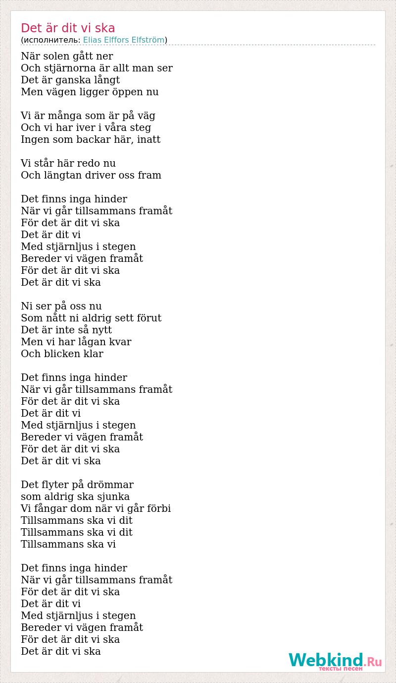 När solen gått ner Och stjärnorna är allt man ser Det är ganska långt Men vägen ligger öppen nu Vi är många som är på väg Och vi har iver i våra steg Ingen som backar här, inatt Vi står här redo nu Och längtan driver oss fram Det finns inga hinder När vi går tillsammans framåt För det är dit vi ska Det är dit vi Med stjärnljus i stegen Bereder vi vägen framåt För det är dit vi ska Det är dit vi ska Ni ser på oss nu Som nått ni aldrig sett förut Det är inte så nytt Men vi har lågan kvar Och blicken klar Det finns inga hinder När vi går tillsammans framåt För det är dit vi ska Det är dit vi Med stjärnljus i stegen Bereder vi vägen framåt För det är dit vi ska Det är dit vi ska Det flyter på drömmar som aldrig ska sjunka Vi fångar dom när vi går förbi Tillsammans ska vi dit Tillsammans ska vi dit Tillsammans ska vi Det finns inga hinder När vi går tillsammans framåt För det är dit vi ska Det är dit vi Med stjärnljus i stegen Bereder vi vägen framåt För det är dit vi ska Det är dit vi ska