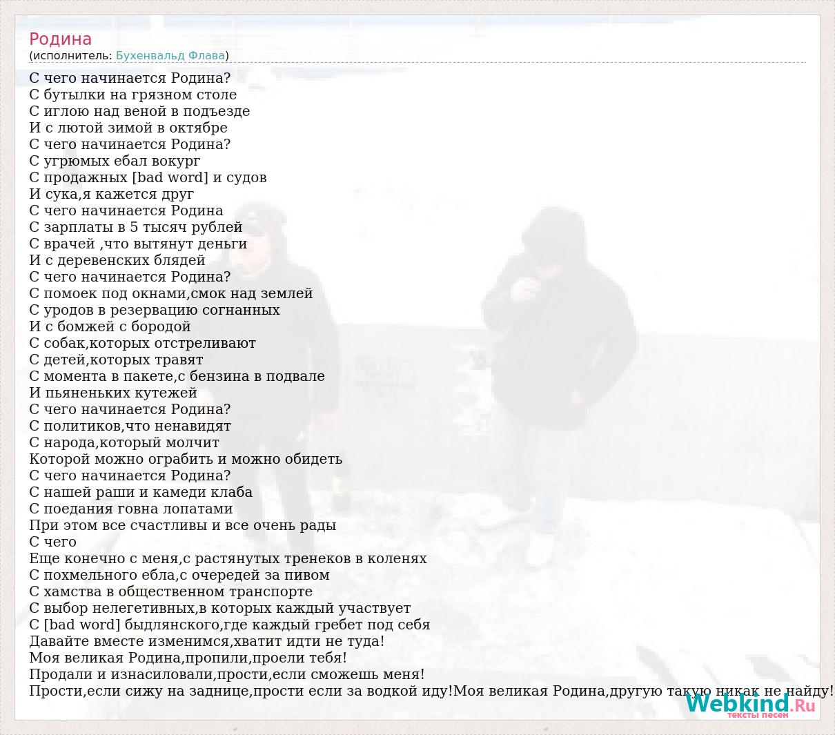С чего начинается Родина? С бутылки на грязном столе С иглою над веной в подъезде И с лютой зимой в октябре С чего начинается Родина? С угрюмых ебал вокург С продажных [bad word] и судов И сука,я кажется друг С чего начинается Родина С зарплаты в 5 тысяч рублей С врачей ,что вытянут деньги И с деревенских блядей С чего начинается Родина? С помоек под окнами,смок над землей С уродов в резервацию согнанных И с бомжей с бородой С собак,которых отстреливают С детей,которых травят С момента в пакете,с бензина в подвале И пьяненьких кутежей С чего начинается Родина? С политиков,что ненавидят С народа,который молчит Которой можно ограбить и можно обидеть С чего начинается Родина? С нашей раши и камеди клаба С поедания говна лопатами При этом все счастливы и все очень рады С чего Еще конечно с меня,с растянутых тренеков в коленях С похмельного ебла,с очередей за пивом С хамства в общественном транспорте С выбор нелегетивных,в которых каждый участвует С [bad word] быдлянского,где каждый гребет под себя Давайте вместе изменимся,хватит идти не туда! Моя великая Родина,пропили,проели тебя! Продали и изнасиловали,прости,если сможешь меня! Прости,если сижу на заднице,прости если за водкой иду!Моя великая Родина,другую такую никак не найду!