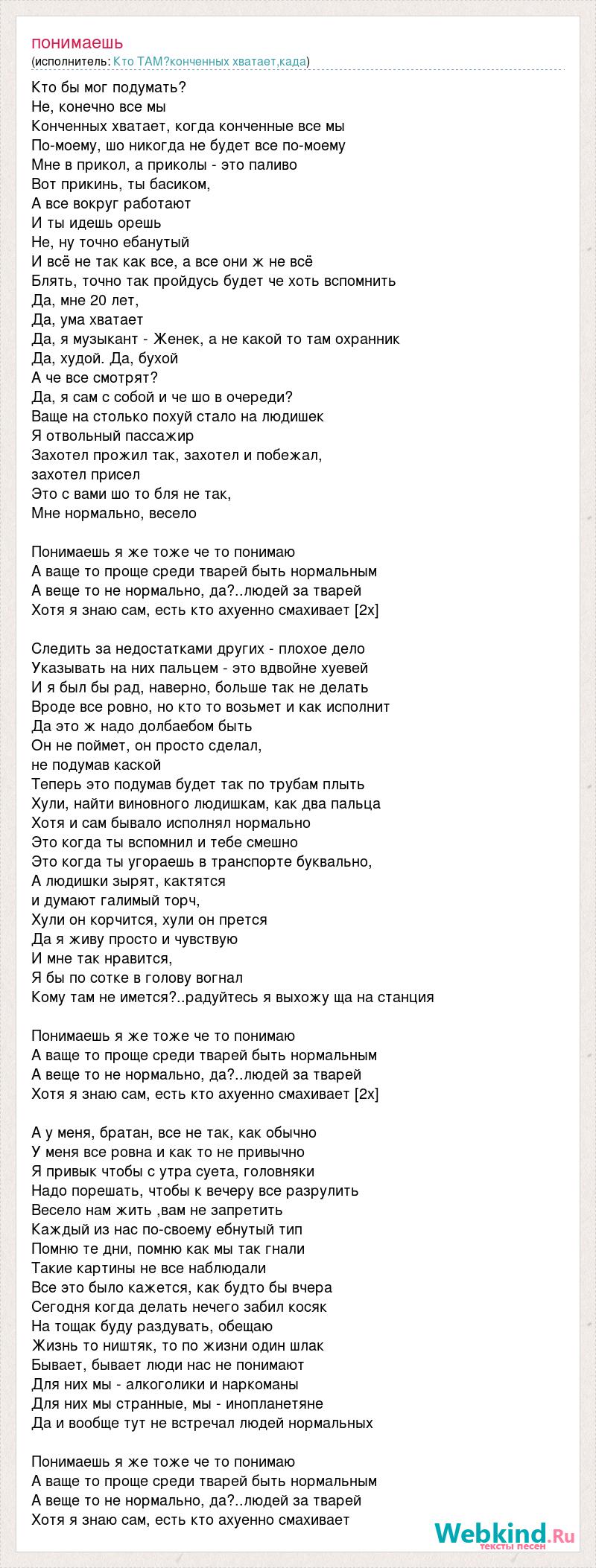 Кто бы мог подумать? Не, конечно все мы Конченных хватает, когда конченные все мы По-моему, шо никогда не будет все по-моему Мне в прикол, а приколы - это паливо Вот прикинь, ты басиком, А все вокруг работают И ты идешь орешь Не, ну точно ебанутый И всё не так как все, а все они ж не всё Блять, точно так пройдусь будет че хоть вспомнить Да, мне 20 лет, Да, ума хватает Да, я музыкант - Женек, а не какой то там охранник Да, худой. Да, бухой А че все смотрят? Да, я сам с собой и че шо в очереди? Ваще на столько похуй стало на людишек Я отвольный пассажир Захотел прожил так, захотел и побежал, захотел присел Это с вами шо то бля не так, Мне нормально, весело Понимаешь я же тоже че то понимаю А ваще то проще среди тварей быть нормальным А веще то не нормально, да?..людей за тварей Хотя я знаю сам, есть кто ахуенно смахивает [2x] Следить за недостатками других - плохое дело Указывать на них пальцем - это вдвойне хуевей И я был бы рад, наверно, больше так не делать Вроде все ровно, но кто то возьмет и как исполнит Да это ж надо долбаебом быть Он не поймет, он просто сделал, не подумав каской Теперь это подумав будет так по трубам плыть Хули, найти виновного людишкам, как два пальца Хотя и сам бывало исполнял нормально Это когда ты вспомнил и тебе смешно Это когда ты угораешь в транспорте буквально, А людишки зырят, кактятся и думают галимый торч, Хули он корчится, хули он прется Да я живу просто и чувствую И мне так нравится, Я бы по сотке в голову вогнал Кому там не имется?..радуйтесь я выхожу ща на станция Понимаешь я же тоже че то понимаю А ваще то проще среди тварей быть нормальным А веще то не нормально, да?..людей за тварей Хотя я знаю сам, есть кто ахуенно смахивает [2x] А у меня, братан, все не так, как обычно У меня все ровна и как то не привычно Я привык чтобы с утра суета, головняки Надо порешать, чтобы к вечеру все разрулить Весело нам жить ,вам не запретить Каждый из нас по-своему ебнутый тип Помню те дни, помню как мы так гнали Такие картины не все наблюдали Все это было кажется, как будто бы вчера Сегодня когда делать нечего забил косяк На тощак буду раздувать, обещаю Жизнь то ништяк, то по жизни один шлак Бывает, бывает люди нас не понимают Для них мы - алкоголики и наркоманы Для них мы странные, мы - инопланетяне Да и вообще тут не встречал людей нормальных Понимаешь я же тоже че то понимаю А ваще то проще среди тварей быть нормальным А веще то не нормально, да?..людей за тварей Хотя я знаю сам, есть кто ахуенно смахивает