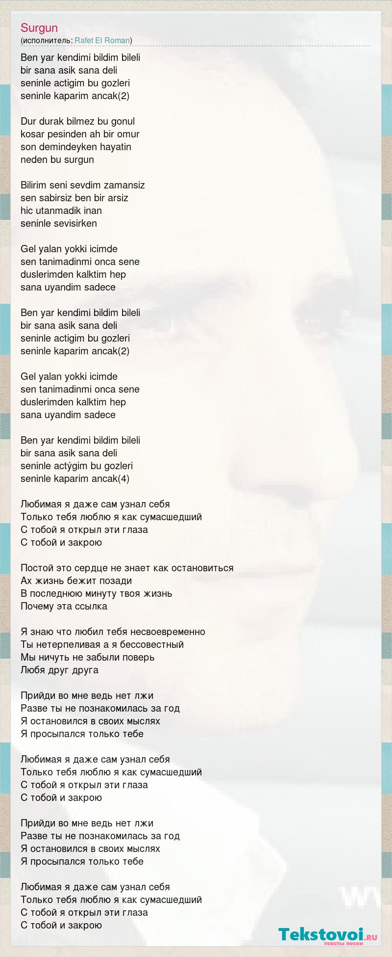 Ben yar kendimi bildim bileli bir sana asik sana deli seninle actigim bu gozleri seninle kaparim ancak(2) Dur durak bilmez bu gonul kosar pesinden ah bir omur son demindeyken hayatin neden bu surgun Bilirim seni sevdim zamansiz sen sabirsiz ben bir arsiz hic utanmadik inan seninle sevisirken Gel yalan yokki icimde sen tanimadinmi onca sene duslerimden kalktim hep sana uyandim sadece Ben yar kendimi bildim bileli bir sana asik sana deli seninle actigim bu gozleri seninle kaparim ancak(2) Gel yalan yokki icimde sen tanimadinmi onca sene duslerimden kalktim hep sana uyandim sadece Ben yar kendimi bildim bileli bir sana asik sana deli seninle actýgim bu gozleri seninle kaparim ancak(4) Любимая я даже сам узнал себя Только тебя люблю я как сумасшедший С тобой я открыл эти глаза С тобой и закрою Постой это сердце не знает как остановиться Ах жизнь бежит позади В последнюю минуту твоя жизнь Почему эта ссылка Я знаю что любил тебя несвоевременно Ты нетерпеливая а я бессовестный Мы ничуть не забыли поверь Любя друг друга Прийди во мне ведь нет лжи Разве ты не познакомилась за год Я остановился в своих мыслях Я просыпался только тебе Любимая я даже сам узнал себя Только тебя люблю я как сумасшедший С тобой я открыл эти глаза С тобой и закрою Прийди во мне ведь нет лжи Разве ты не познакомилась за год Я остановился в своих мыслях Я просыпался только тебе Любимая я даже сам узнал себя Только тебя люблю я как сумасшедший С тобой я открыл эти глаза С тобой и закрою
