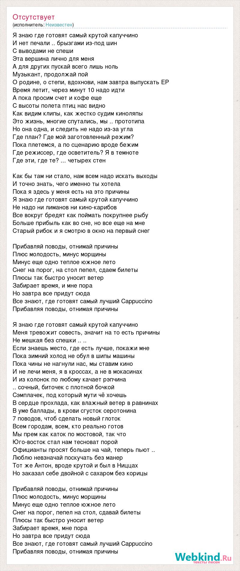 Я знаю где готовят самый крутой капуччино И нет печали .. брызгами из-под шин С выводами не спеши Эта вершина лично для меня А для других пускай всего лишь ноль Музыкант, продолжай пой О родине, о степи, вдохнови, нам завтра выпускать EP Время летит, через минут 10 надо идти А пока просим счет и кофе еще С высоты полета птиц нас видно Как видим клипы, как жестко судим киноляпы Это жизнь, многие спутались, мы .. прототипа Но она одна, и следить не надо из-за угла Где план? Где мой заготовленный режим? Пока плетемся, а по сценарию вроде бежим Где режиссер, где осветитель? Я в темноте Где эти, где те? ... четырех стен Как бы там ни стало, нам всем надо искать выходы И точно знать, чего именно ты хотела Пока я здесь у меня есть на это причины Я знаю где готовят самый крутой капуччино Не надо ни лиманов ни кино-карибов Все вокруг бредят как поймать покрупнее рыбу Больше прибыль как во сне, но все еще на мне Старый рибок и я смотрю в окно на первый снег Прибавляй поводы, отнимай причины Плюс молодость, минус морщины Минус еще одно теплое южное лето Снег на порог, на стол пепел, сдаем билеты Плюсы так быстро уносит ветер Забирает время, и мне пора Но завтра все придут сюда Все знают, где готовят самый лучший Сappuccino Прибавляя поводы, отнимая причины Я знаю где готовят самый крутой капуччино Меня тревожит совесть, значит на то есть причины Не мешкая без спешки .. .. Если знаешь место, где есть лучше, покажи мне Пока зимний холод не обул в шипы машины Пока чины не нагнули нас, мы ставим кино И не лечи меня, я в кроссах, а не в мокасинах И из колонок по любому качает рэпчина .. сочный, биточек с плотной бочкой Сэмплачек, под который мути чё хочешь В сердце прохлада, как влажный ветер в равнинах В уме баллады, в крови сгусток серотонина 7 поводов, чтоб сделать новый глоток Всем городам, всем, кто реально готов Мы прем как каток по мостовой, так что Юго-восток стал нам тесноват порой Официанты просят больше на чай, теперь пьют .. Люблю невзначай поскучать без манер Тот же Антон, вроде крутой и был в Ниццах Но заказал себе двойной с сахаром без корицы Прибавляй поводы, отнимай причины Плюс молодость, минус морщины Минус еще одно теплое южное лето Снег на порог, пепел на стол, сдавай билеты Плюсы так быстро уносит ветер Забирает время, мне пора Но завтра все придут сюда Все знают, где готовят самый лучший Сappuccino Прибавляя поводы, отнимая причины