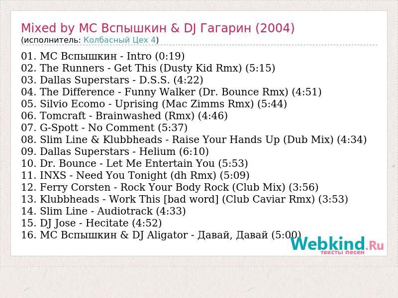 01. МС Вспышкин - Intro (0:19) 02. The Runners - Get This (Dusty Kid Rmx) (5:15) 03. Dallas Superstars - D.S.S. (4:22) 04. The Difference - Funny Walker (Dr. Bounce Rmx) (4:51) 05. Silvio Ecomo - Uprising (Mac Zimms Rmx) (5:44) 06. Tomcraft - Brainwashed (Rmx) (4:46) 07. G-Spott - No Comment (5:37) 08. Slim Line & Klubbheads - Raise Your Hands Up (Dub Mix) (4:34) 09. Dallas Superstars - Helium (6:10) 10. Dr. Bounce - Let Me Entertain You (5:53) 11. INXS - Need You Tonight (dh Rmx) (5:09) 12. Ferry Corsten - Rock Your Body Rock (Club Mix) (3:56) 13. Klubbheads - Work This [bad word] (Club Caviar Rmx) (3:53) 14. Slim Line - Audiotrack (4:33) 15. DJ Jose - Hecitate (4:52) 16. МС Вспышкин & DJ Aligator - Давай, Давай (5:00)