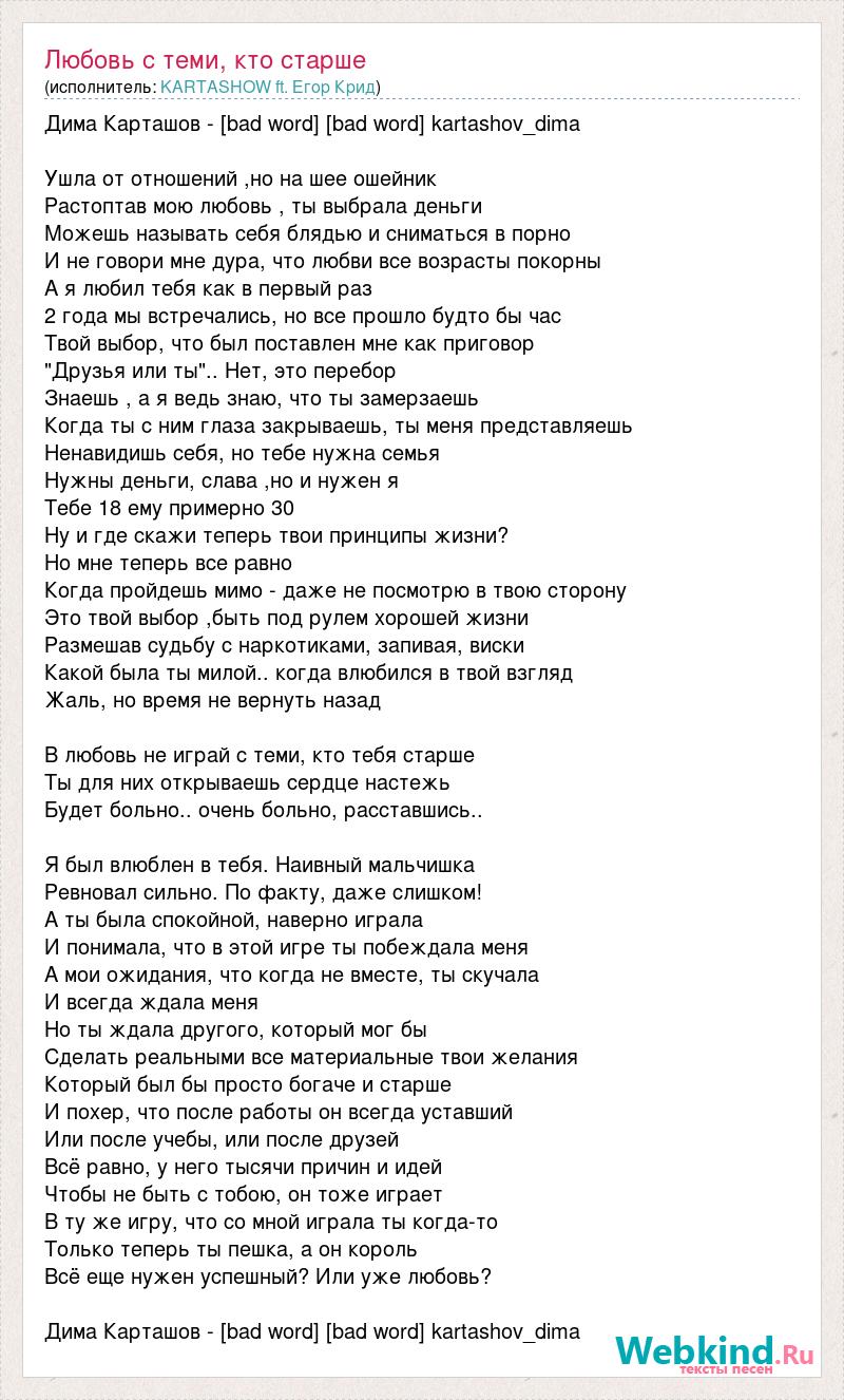 Дима Карташов - [bad word] [bad word] kartashov_dima Ушла от отношений ,но на шее ошейник Растоптав мою любовь , ты выбрала деньги Можешь называть себя блядью и сниматься в порно И не говори мне дура, что любви все возрасты покорны А я любил тебя как в первый раз 2 года мы встречались, но все прошло будто бы час Твой выбор, что был поставлен мне как приговор "Друзья или ты".. Нет, это перебор Знаешь , а я ведь знаю, что ты замерзаешь Когда ты с ним глаза закрываешь, ты меня представляешь Ненавидишь себя, но тебе нужна семья Нужны деньги, слава ,но и нужен я Тебе 18 ему примерно 30 Ну и где скажи теперь твои принципы жизни? Но мне теперь все равно Когда пройдешь мимо - даже не посмотрю в твою сторону Это твой выбор ,быть под рулем хорошей жизни Размешав судьбу с наркотиками, запивая, виски Какой была ты милой.. когда влюбился в твой взгляд Жаль, но время не вернуть назад В любовь не играй с теми, кто тебя старше Ты для них открываешь сердце настежь Будет больно.. очень больно, расставшись.. Я был влюблен в тебя. Наивный мальчишка Ревновал сильно. По факту, даже слишком! А ты была спокойной, наверно играла И понимала, что в этой игре ты побеждала меня А мои ожидания, что когда не вместе, ты скучала И всегда ждала меня Но ты ждала другого, который мог бы Сделать реальными все материальные твои желания Который был бы просто богаче и старше И похер, что после работы он всегда уставший Или после учебы, или после друзей Всё равно, у него тысячи причин и идей Чтобы не быть с тобою, он тоже играет В ту же игру, что со мной играла ты когда-то Только теперь ты пешка, а он король Всё еще нужен успешный? Или уже любовь? Дима Карташов - [bad word] [bad word] kartashov_dima