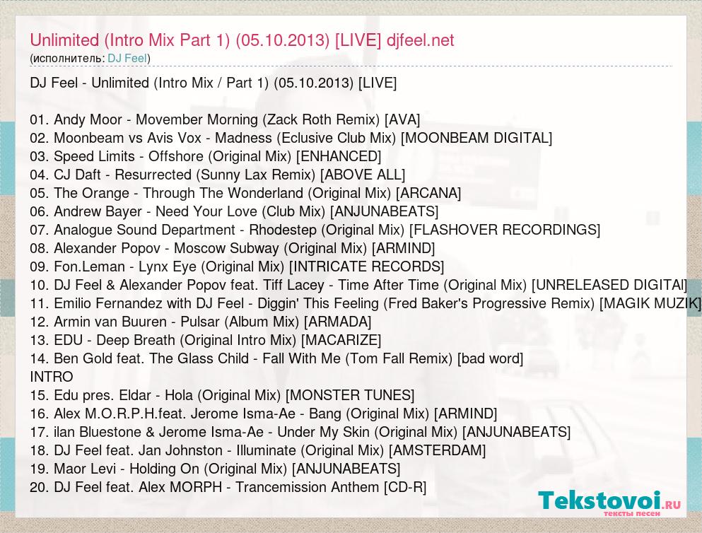 DJ Feel - Unlimited (Intro Mix / Part 1) (05.10.2013) [LIVE] 01. Andy Moor - Movember Morning (Zack Roth Remix) [AVA] 02. Moonbeam vs Avis Vox - Madness (Eclusive Club Mix) [MOONBEAM DIGITAL] 03. Speed Limits - Offshore (Original Mix) [ENHANCED] 04. CJ Daft - Resurrected (Sunny Lax Remix) [ABOVE ALL] 05. The Orange - Through The Wonderland (Original Mix) [ARCANA] 06. Andrew Bayer - Need Your Love (Club Mix) [ANJUNABEATS] 07. Analogue Sound Department - Rhodestep (Original Mix) [FLASHOVER RECORDINGS] 08. Alexander Popov - Moscow Subway (Original Mix) [ARMIND] 09. Fon.Leman - Lynx Eye (Original Mix) [INTRICATE RECORDS] 10. DJ Feel & Alexander Popov feat. Tiff Lacey - Time After Time (Original Mix) [UNRELEASED DIGITAl] 11. Emilio Fernandez with DJ Feel - Diggin' This Feeling (Fred Baker's Progressive Remix) [MAGIK MUZIK] 12. Armin van Buuren - Pulsar (Album Mix) [ARMADA] 13. EDU - Deep Breath (Original Intro Mix) [MACARIZE] 14. Ben Gold feat. The Glass Child - Fall With Me (Tom Fall Remix) [bad word] INTRO 15. Edu pres. Eldar - Hola (Original Mix) [MONSTER TUNES] 16. Alex M.O.R.P.H.feat. Jerome Isma-Ae - Bang (Original Mix) [ARMIND] 17. ilan Bluestone & Jerome Isma-Ae - Under My Skin (Original Mix) [ANJUNABEATS] 18. DJ Feel feat. Jan Johnston - Illuminate (Original Mix) [AMSTERDAM] 19. Maor Levi - Holding On (Original Mix) [ANJUNABEATS] 20. DJ Feel feat. Alex MORPH - Trancemission Anthem [CD-R]