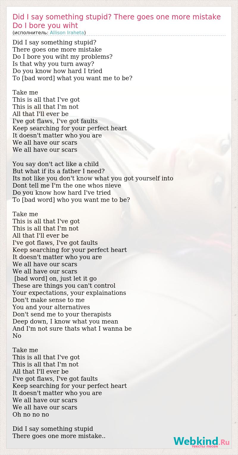 Did I say something stupid? There goes one more mistake Do I bore you wiht my problems? Is that why you turn away? Do you know how hard I tried To [bad word] what you want me to be? Take me This is all that I've got This is all that I'm not All that I'll ever be I've got flaws, I've got faults Keep searching for your perfect heart It doesn't matter who you are We all have our scars We all have our scars You say don't act like a child But what if its a father I need? Its not like you don't know what you got yourself into Dont tell me I'm the one whos nieve Do you know how hard I've tried To [bad word] who you want me to be? Take me This is all that I've got This is all that I'm not All that I'll ever be I've got flaws, I've got faults Keep searching for your perfect heart It doesn't matter who you are We all have our scars We all have our scars [bad word] on, just let it go These are things you can't control Your expectations, your explainations Don't make sense to me You and your alternatives Don't send me to your therapists Deep down, I know what you mean And I'm not sure thats what I wanna be No Take me This is all that I've got This is all that I'm not All that I'll ever be I've got flaws, I've got faults Keep searching for your perfect heart It doesn't matter who you are We all have our scars We all have our scars Oh no no no Did I say something stupid There goes one more mistake..