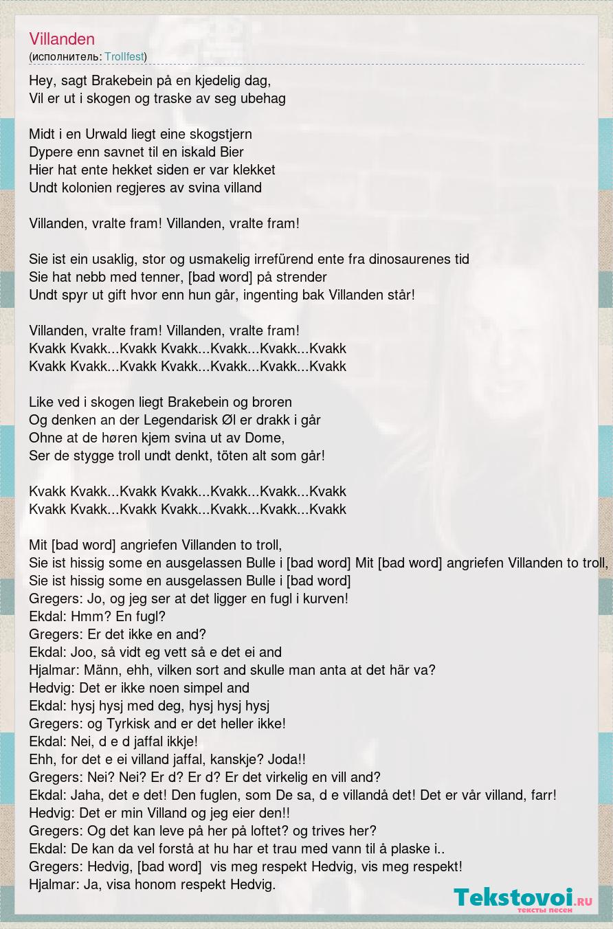 Hey, sagt Brakebein på en kjedelig dag, Vil er ut i skogen og traske av seg ubehag Midt i en Urwald liegt eine skogstjern Dypere enn savnet til en iskald Bier Hier hat ente hekket siden er var klekket Undt kolonien regjeres av svina villand Villanden, vralte fram! Villanden, vralte fram! Sie ist ein usaklig, stor og usmakelig irrefürend ente fra dinosaurenes tid Sie hat nebb med tenner, [bad word] på strender Undt spyr ut gift hvor enn hun går, ingenting bak Villanden står! Villanden, vralte fram! Villanden, vralte fram! Kvakk Kvakk...Kvakk Kvakk...Kvakk...Kvakk...Kvakk Kvakk Kvakk...Kvakk Kvakk...Kvakk...Kvakk...Kvakk Like ved i skogen liegt Brakebein og broren Og denken an der Legendarisk Øl er drakk i går Ohne at de høren kjem svina ut av Dome, Ser de stygge troll undt denkt, töten alt som går! Kvakk Kvakk...Kvakk Kvakk...Kvakk...Kvakk...Kvakk Kvakk Kvakk...Kvakk Kvakk...Kvakk...Kvakk...Kvakk Mit [bad word] angriefen Villanden to troll, Sie ist hissig some en ausgelassen Bulle i [bad word] Mit [bad word] angriefen Villanden to troll, Sie ist hissig some en ausgelassen Bulle i [bad word] Gregers: Jo, og jeg ser at det ligger en fugl i kurven! Ekdal: Hmm? En fugl? Gregers: Er det ikke en and? Ekdal: Joo, så vidt eg vett så e det ei and Hjalmar: Männ, ehh, vilken sort and skulle man anta at det här va? Hedvig: Det er ikke noen simpel and Ekdal: hysj hysj med deg, hysj hysj hysj Gregers: og Tyrkisk and er det heller ikke! Ekdal: Nei, d e d jaffal ikkje! Ehh, for det e ei villand jaffal, kanskje? Joda!! Gregers: Nei? Nei? Er d? Er d? Er det virkelig en vill and? Ekdal: Jaha, det e det! Den fuglen, som De sa, d e villandå det! Det er vår villand, farr! Hedvig: Det er min Villand og jeg eier den!! Gregers: Og det kan leve på her på loftet? og trives her? Ekdal: De kan da vel forstå at hu har et trau med vann til å plaske i.. Gregers: Hedvig, [bad word] vis meg respekt Hedvig, vis meg respekt! Hjalmar: Ja, visa honom respekt Hedvig.