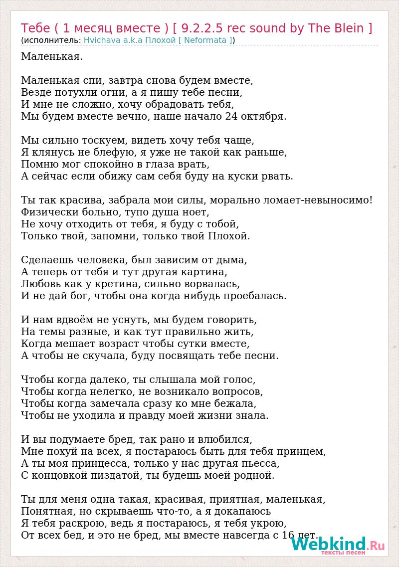 Маленькая. Маленькая спи, завтра снова будем вместе, Везде потухли огни, а я пишу тебе песни, И мне не сложно, хочу обрадовать тебя, Мы будем вместе вечно, наше начало 24 октября. Мы сильно тоскуем, видеть хочу тебя чаще, Я клянусь не блефую, я уже не такой как раньше, Помню мог спокойно в глаза врать, А сейчас если обижу сам себя буду на куски рвать. Ты так красива, забрала мои силы, морально ломает-невыносимо! Физически больно, тупо душа ноет, Не хочу отходить от тебя, я буду с тобой, Только твой, запомни, только твой Плохой. Сделаешь человека, был зависим от дыма, А теперь от тебя и тут другая картина, Любовь как у кретина, сильно ворвалась, И не дай бог, чтобы она когда нибудь проебалась. И нам вдвоём не уснуть, мы будем говорить, На темы разные, и как тут правильно жить, Когда мешает возраст чтобы сутки вместе, А чтобы не скучала, буду посвящать тебе песни. Чтобы когда далеко, ты слышала мой голос, Чтобы когда нелегко, не возникало вопросов, Чтобы когда замечала сразу ко мне бежала, Чтобы не уходила и правду моей жизни знала. И вы подумаете бред, так рано и влюбился, Мне похуй на всех, я постараюсь быть для тебя принцем, А ты моя принцесса, только у нас другая пьесса, С концовкой пиздатой, ты будешь моей родной. Ты для меня одна такая, красивая, приятная, маленькая, Понятная, но скрываешь что-то, а я докапаюсь Я тебя раскрою, ведь я постараюсь, я тебя укрою, От всех бед, и это не бред, мы вместе навсегда с 16 лет.