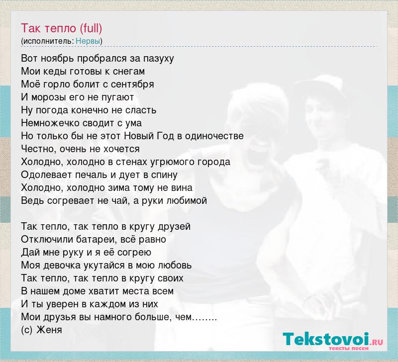 Вот ноябрь пробрался за пазуху Мои кеды готовы к снегам Моё горло болит с сентября И морозы его не пугают Ну погода конечно не сласть Немножечко сводит с ума Но только бы не этот Новый Год в одиночестве Честно, очень не хочется Холодно, холодно в стенах угрюмого города Одолевает печаль и дует в спину Холодно, холодно зима тому не вина Ведь согревает не чай, а руки любимой Так тепло, так тепло в кругу друзей Отключили батареи, всё равно Дай мне руку и я её согрею Моя девочка укутайся в мою любовь Так тепло, так тепло в кругу своих В нашем доме хватит места всем И ты уверен в каждом из них Мои друзья вы намного больше, чем…….. (с) Женя