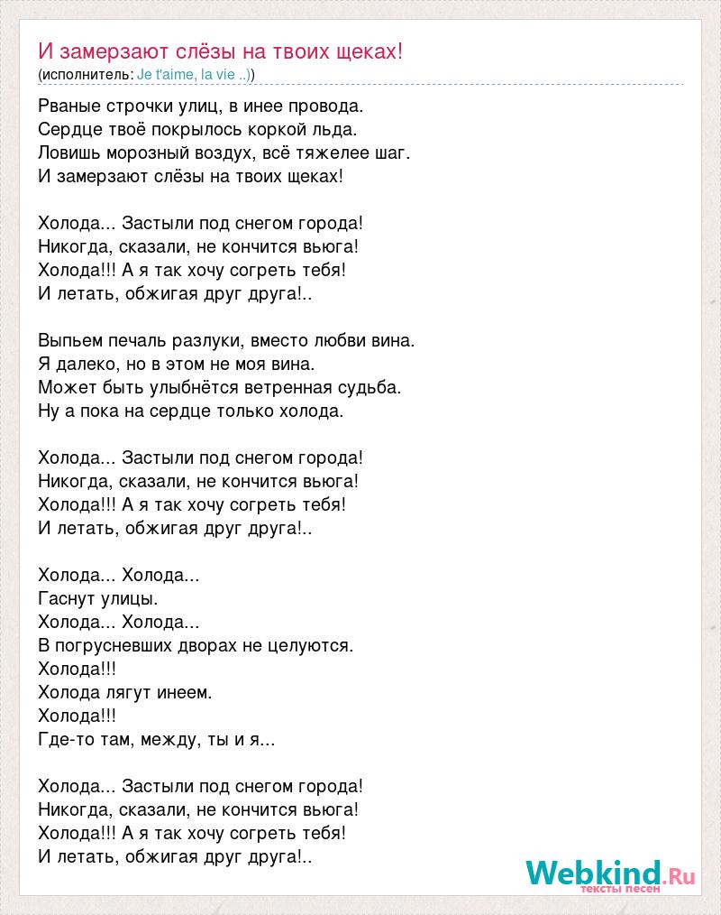 Рваные строчки улиц, в инее провода. Сердце твоё покрылось коркой льда. Ловишь морозный воздух, всё тяжелее шаг. И замерзают слёзы на твоих щеках! Холода... Застыли под снегом города! Никогда, сказали, не кончится вьюга! Холода!!! А я так хочу согреть тебя! И летать, обжигая друг друга!.. Выпьем печаль разлуки, вместо любви вина. Я далеко, но в этом не моя вина. Может быть улыбнётся ветренная судьба. Ну а пока на сердце только холода. Холода... Застыли под снегом города! Никогда, сказали, не кончится вьюга! Холода!!! А я так хочу согреть тебя! И летать, обжигая друг друга!.. Холода... Холода... Гаснут улицы. Холода... Холода... В погрусневших дворах не целуются. Холода!!! Холода лягут инеем. Холода!!! Где-то там, между, ты и я... Холода... Застыли под снегом города! Никогда, сказали, не кончится вьюга! Холода!!! А я так хочу согреть тебя! И летать, обжигая друг друга!..
