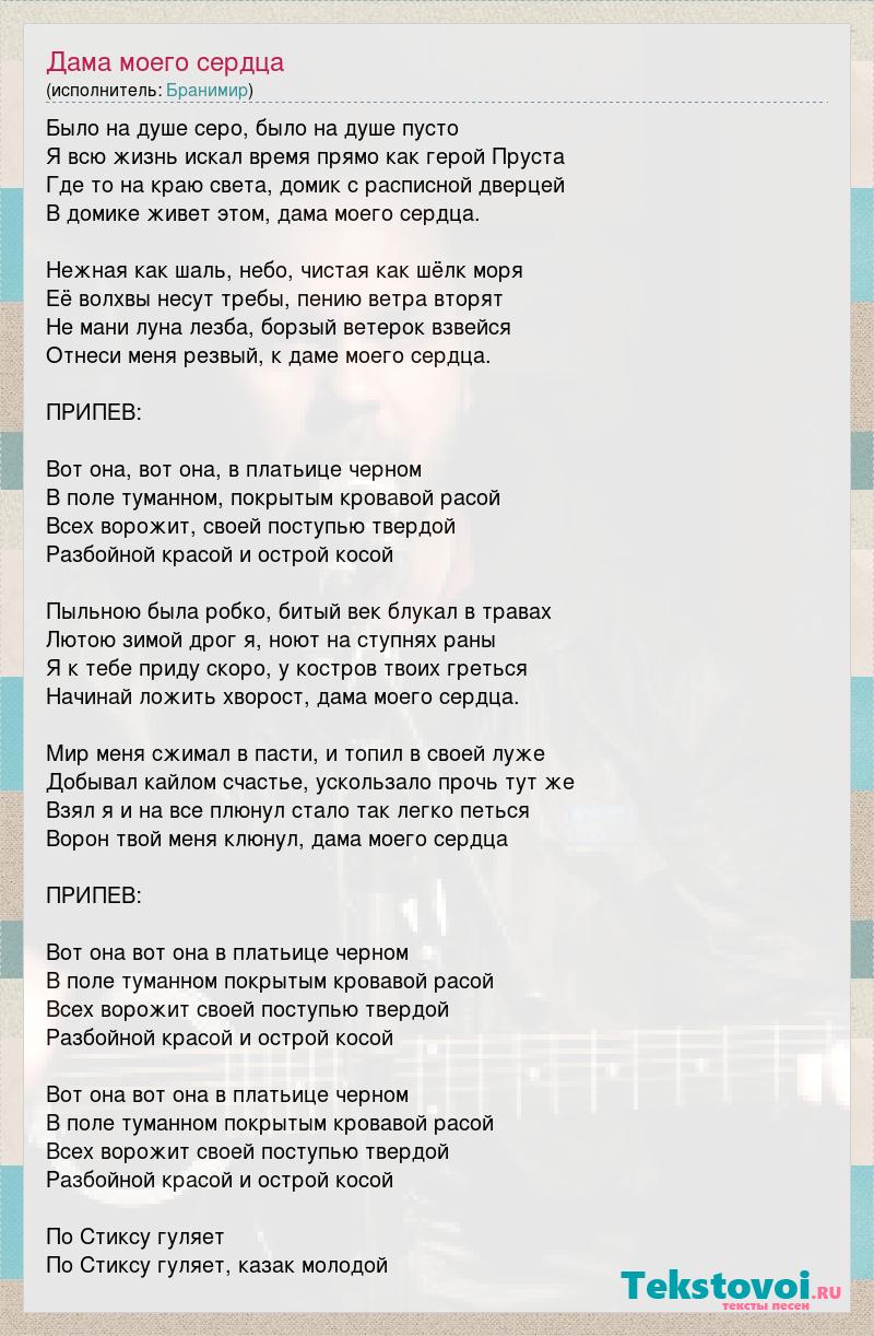 Было на душе серо, было на душе пусто Я всю жизнь искал время прямо как герой Пруста Где то на краю света, домик с расписной дверцей В домике живет этом, дама моего сердца. Нежная как шаль, небо, чистая как шёлк моря Её волхвы несут требы, пению ветра вторят Не мани луна лезба, борзый ветерок взвейся Отнеси меня резвый, к даме моего сердца. ПРИПЕВ: Вот она, вот она, в платьице черном В поле туманном, покрытым кровавой расой Всех ворожит, своей поступью твердой Разбойной красой и острой косой Пыльною была робко, битый век блукал в травах Лютою зимой дрог я, ноют на ступнях раны Я к тебе приду скоро, у костров твоих греться Начинай ложить хворост, дама моего сердца. Мир меня сжимал в пасти, и топил в своей луже Добывал кайлом счастье, ускользало прочь тут же Взял я и на все плюнул стало так легко петься Ворон твой меня клюнул, дама моего сердца ПРИПЕВ: Вот она вот она в платьице черном В поле туманном покрытым кровавой расой Всех ворожит своей поступью твердой Разбойной красой и острой косой Вот она вот она в платьице черном В поле туманном покрытым кровавой расой Всех ворожит своей поступью твердой Разбойной красой и острой косой По Cтиксу гуляет По Cтиксу гуляет, казак молодой