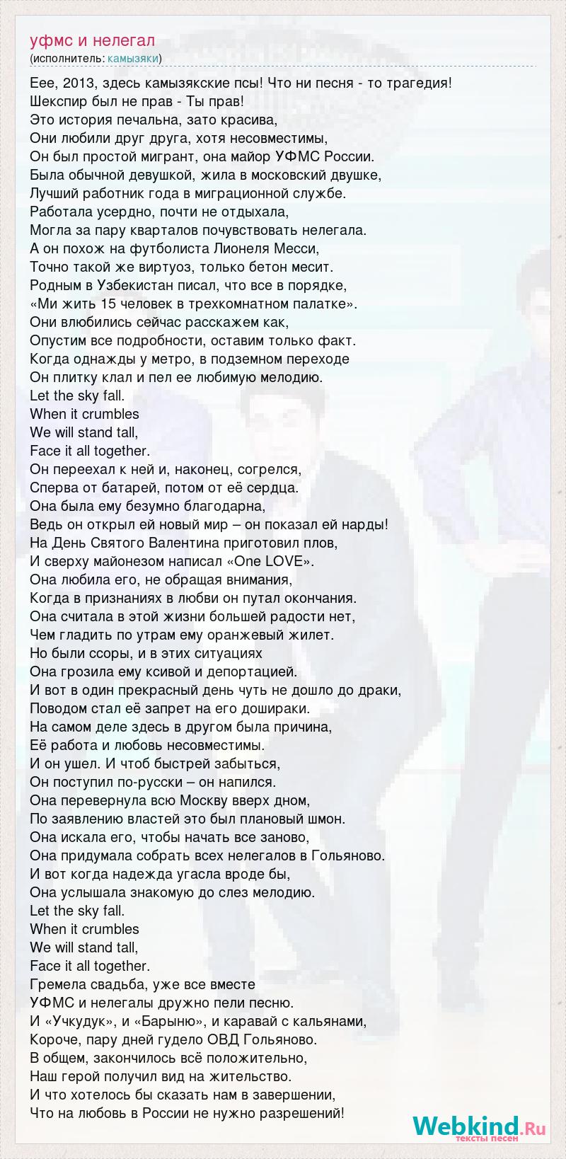 Еее, 2013, здесь камызякские псы! Что ни песня - то трагедия! Шекспир был не прав - Ты прав! Это история печальна, зато красива, Они любили друг друга, хотя несовместимы, Он был простой мигрант, она майор УФМС России. Была обычной девушкой, жила в московский двушке, Лучший работник года в миграционной службе. Работала усердно, почти не отдыхала, Могла за пару кварталов почувствовать нелегала. А он похож на футболиста Лионеля Месси, Точно такой же виртуоз, только бетон месит. Родным в Узбекистан писал, что все в порядке, «Ми жить 15 человек в трехкомнатном палатке». Они влюбились сейчас расскажем как, Опустим все подробности, оставим только факт. Когда однажды у метро, в подземном переходе Он плитку клал и пел ее любимую мелодию. Let the sky fall. When it crumbles We will stand tall, Face it all together. Он переехал к ней и, наконец, согрелся, Сперва от батарей, потом от её сердца. Она была ему безумно благодарна, Ведь он открыл ей новый мир – он показал ей нарды! На День Святого Валентина приготовил плов, И сверху майонезом написал «One LOVE». Она любила его, не обращая внимания, Когда в признаниях в любви он путал окончания. Она считала в этой жизни большей радости нет, Чем гладить по утрам ему оранжевый жилет. Но были ссоры, и в этих ситуациях Она грозила ему ксивой и депортацией. И вот в один прекрасный день чуть не дошло до драки, Поводом стал её запрет на его дошираки. На самом деле здесь в другом была причина, Её работа и любовь несовместимы. И он ушел. И чтоб быстрей забыться, Он поступил по-русски – он напился. Она перевернула всю Москву вверх дном, По заявлению властей это был плановый шмон. Она искала его, чтобы начать все заново, Она придумала собрать всех нелегалов в Гольяново. И вот когда надежда угасла вроде бы, Она услышала знакомую до слез мелодию. Let the sky fall. When it crumbles We will stand tall, Face it all together. Гремела свадьба, уже все вместе УФМС и нелегалы дружно пели песню. И «Учкудук», и «Барыню», и каравай с кальянами, Короче, пару дней гудело ОВД Гольяново. В общем, закончилось всё положительно, Наш герой получил вид на жительство. И что хотелось бы сказать нам в завершении, Что на любовь в России не нужно разрешений!