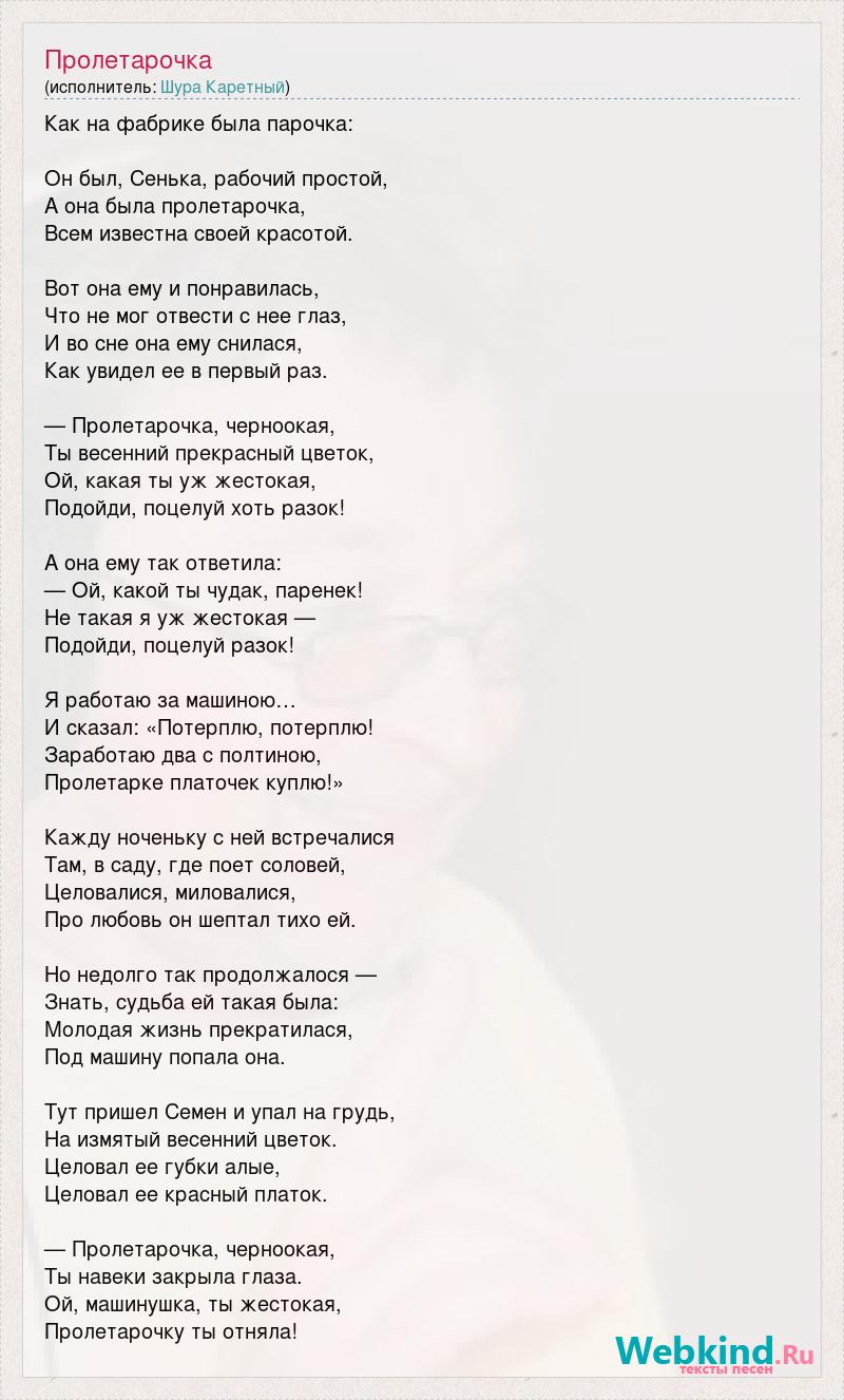Как на фабрике была парочка: Он был, Сенька, рабочий простой, А она была пролетарочка, Всем известна своей красотой. Вот она ему и понравилась, Что не мог отвести с нее глаз, И во сне она ему снилася, Как увидел ее в первый раз. — Пролетарочка, черноокая, Ты весенний прекрасный цветок, Ой, какая ты уж жестокая, Подойди, поцелуй хоть разок! А она ему так ответила: — Ой, какой ты чудак, паренек! Не такая я уж жестокая — Подойди, поцелуй разок! Я работаю за машиною… И сказал: «Потерплю, потерплю! Заработаю два с полтиною, Пролетарке платочек куплю!» Кажду ноченьку с ней встречалися Там, в саду, где поет соловей, Целовалися, миловалися, Про любовь он шептал тихо ей. Но недолго так продолжалося — Знать, судьба ей такая была: Молодая жизнь прекратилася, Под машину попала она. Тут пришел Семен и упал на грудь, На измятый весенний цветок. Целовал ее губки алые, Целовал ее красный платок. — Пролетарочка, черноокая, Ты навеки закрыла глаза. Ой, машинушка, ты жестокая, Пролетарочку ты отняла!